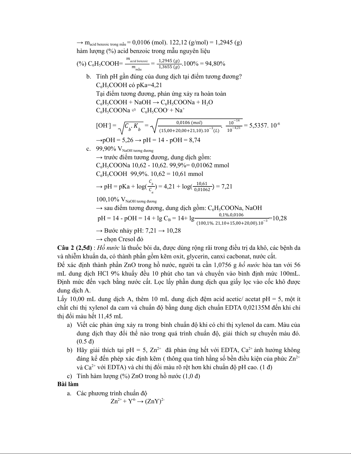 c) Tính hàm lượng (%) ZnO trong hồ nước (1,0 đ) Bài làm