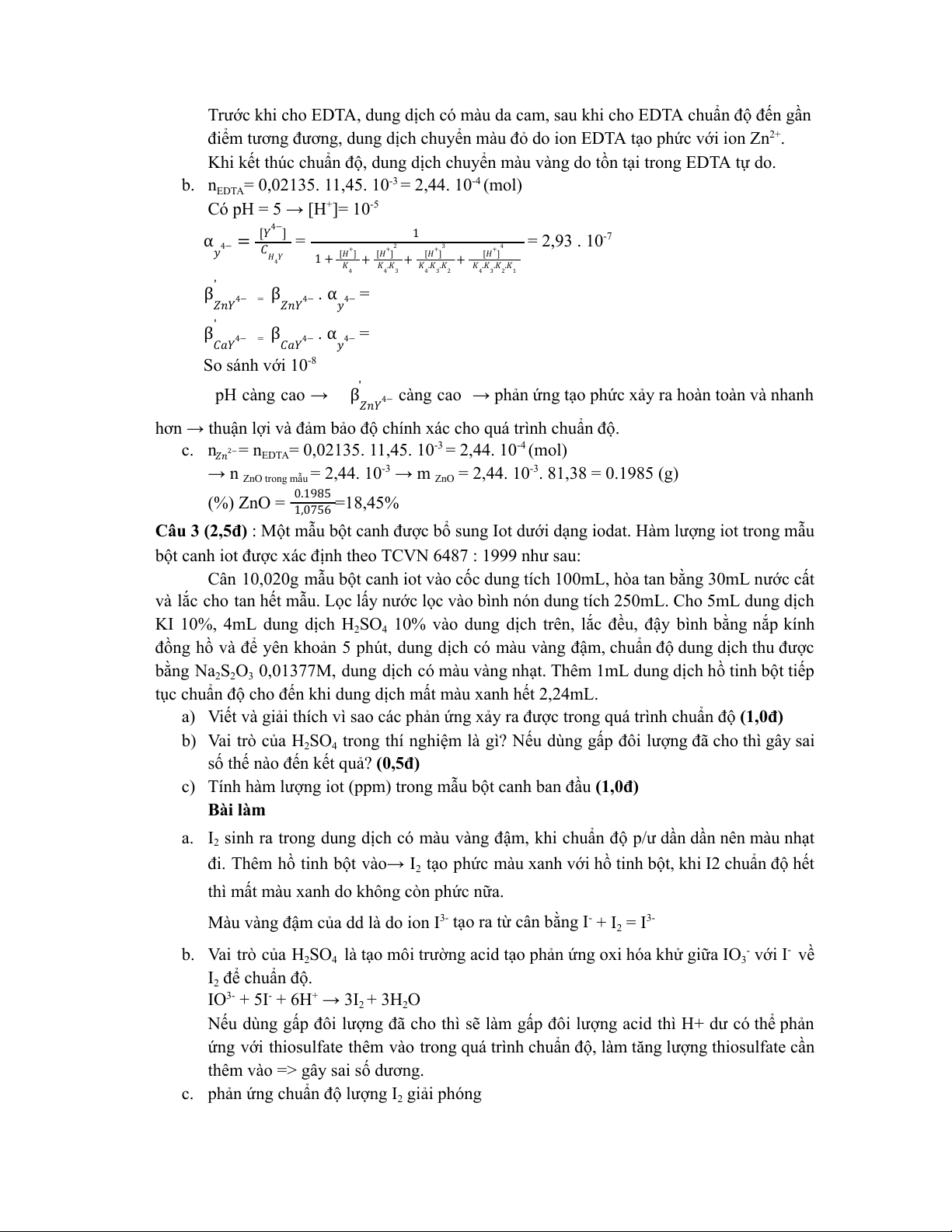 Câu 3 (2,5đ) : Một mẫu bột canh được bổ sung Iot dưới dạng iodat. Hàm lượng iot trong mẫu