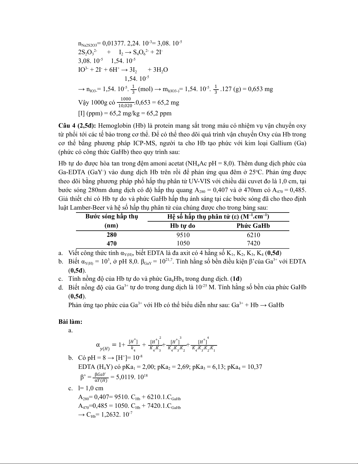 c. Tính nồng độ của Hb tự do và phức Ga4Hb4 trong dung dịch. (1đ)
