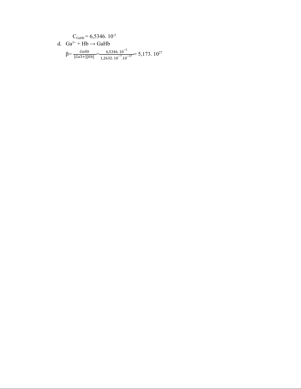 A470=0,485 = 1050. CHb + 7420.1.CGaHb → C -7 Hb= 1,2632. 10 CGaHb = 6,5346. 10-5 d. Ga3+ + Hb → GaHb −5 β= 𝐺𝑎𝐻𝑏 = 6,5346. 10 = 5,173. 1027 [𝐺𝑎3+][𝐻𝑏] −7 −27 1,2632. 10 .10