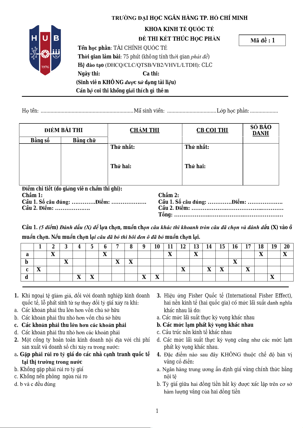 Họ tên: . . . . . . . . . . . . . . . . . . . . . . . . . . . . . . . . . Mã sinh viên: . . . . . . . . . . . . . . . . . . Lớp học phần :. . . . . . . . . . ĐIỂM BÀI THI CHẤM THI CB COI THI SỐ BÁO DANH Bằng số Bằng chữ Thứ n ấ h t: Thứ n ấ h t: Thứ hai: Thứ hai: