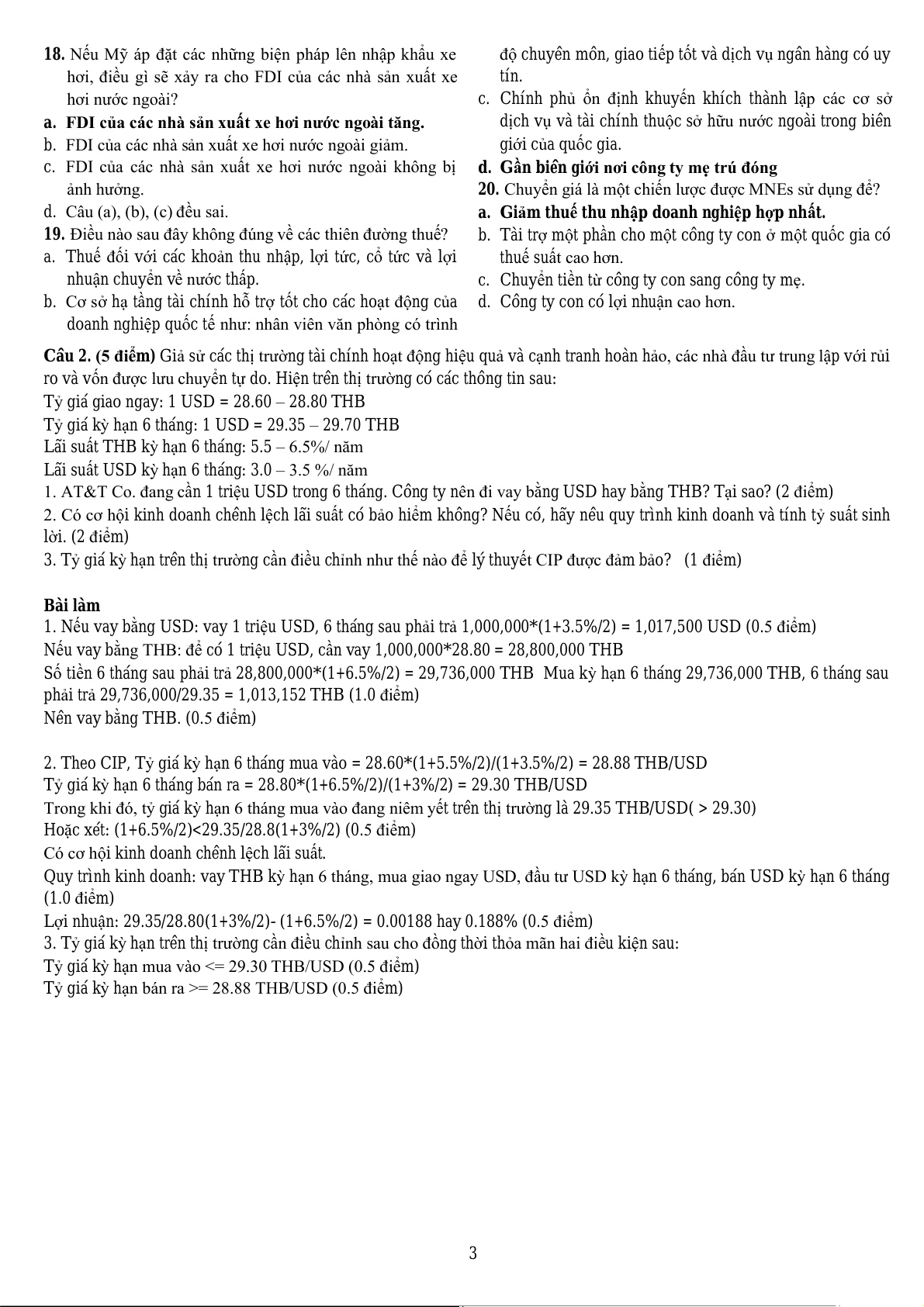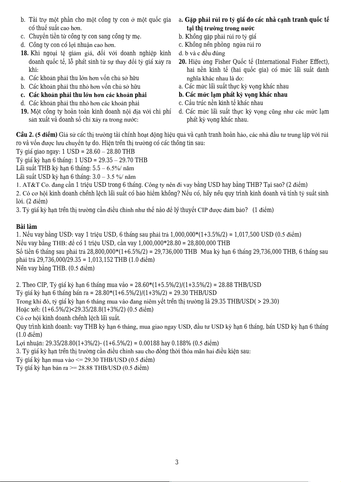 1. AT&T Co. đang cần 1 triệu USD trong 6 tháng. Công ty nên đi vay bằng USD hay bằng THB? Tại sao? (2 điểm)
