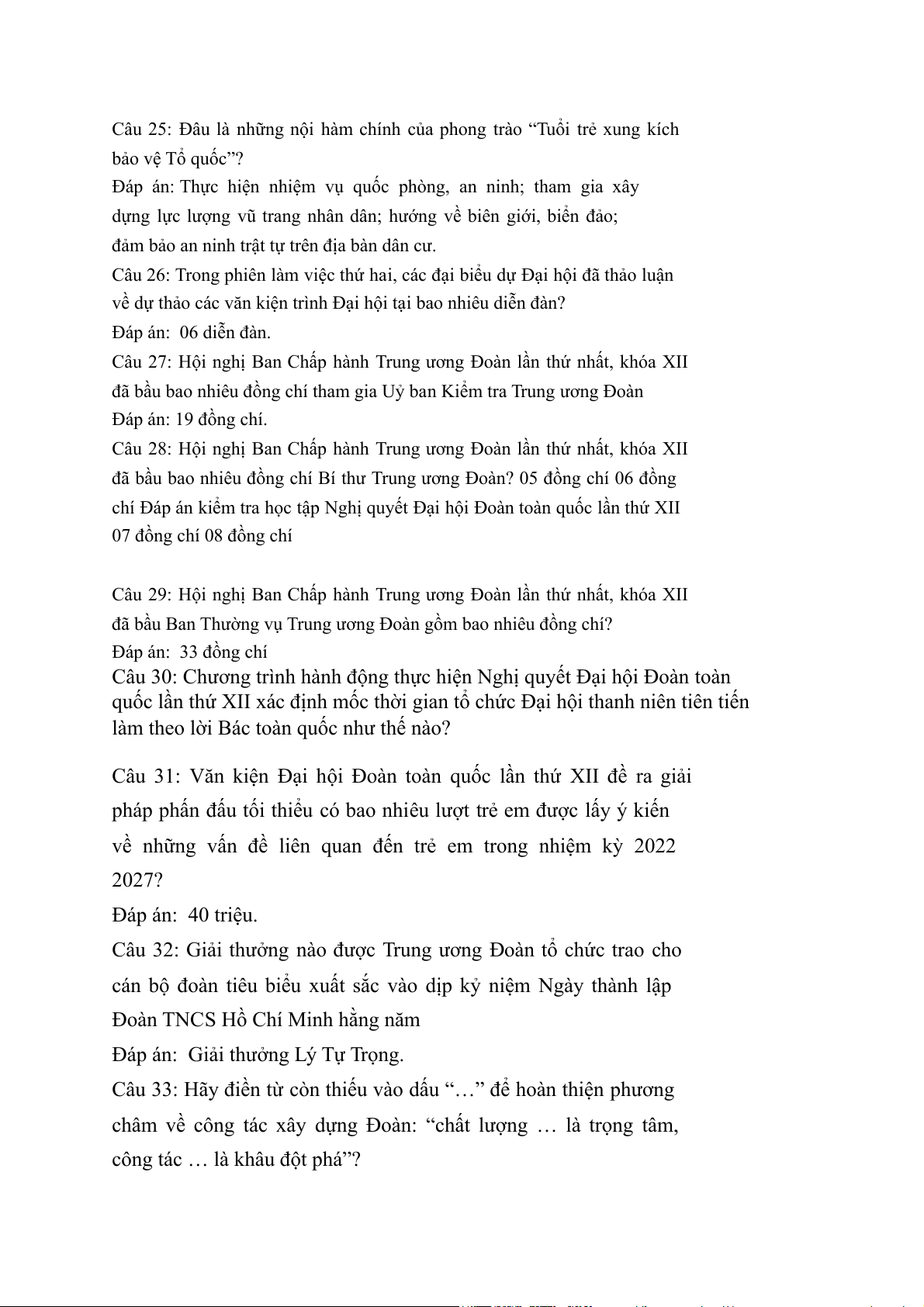 Câu 30: Chương trình hành động thực hiện Nghị quyết Đại hội Đoàn toàn