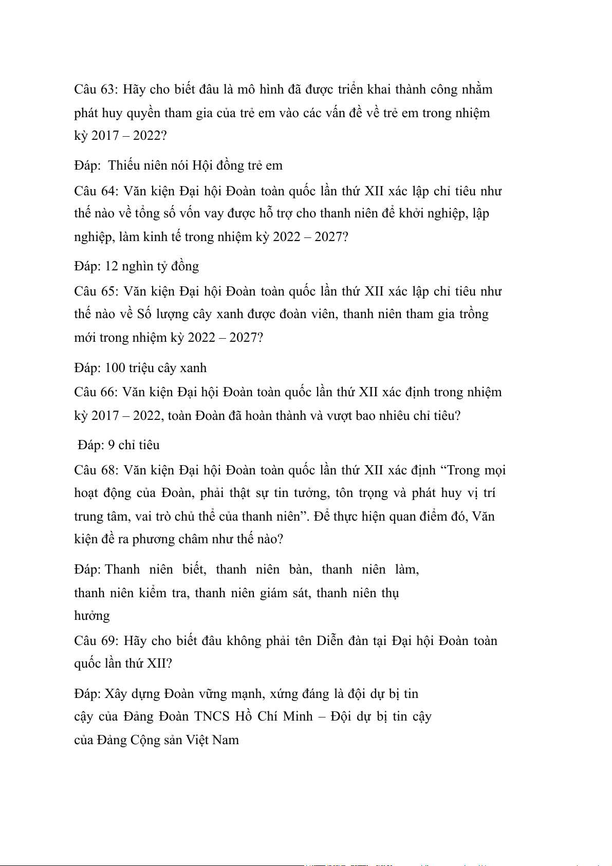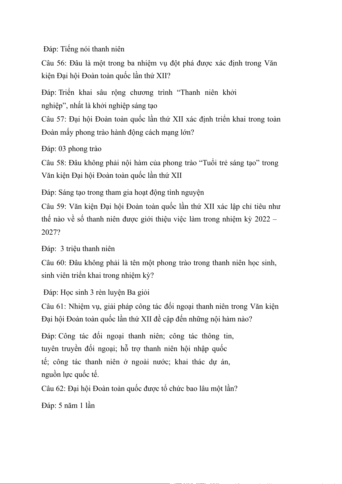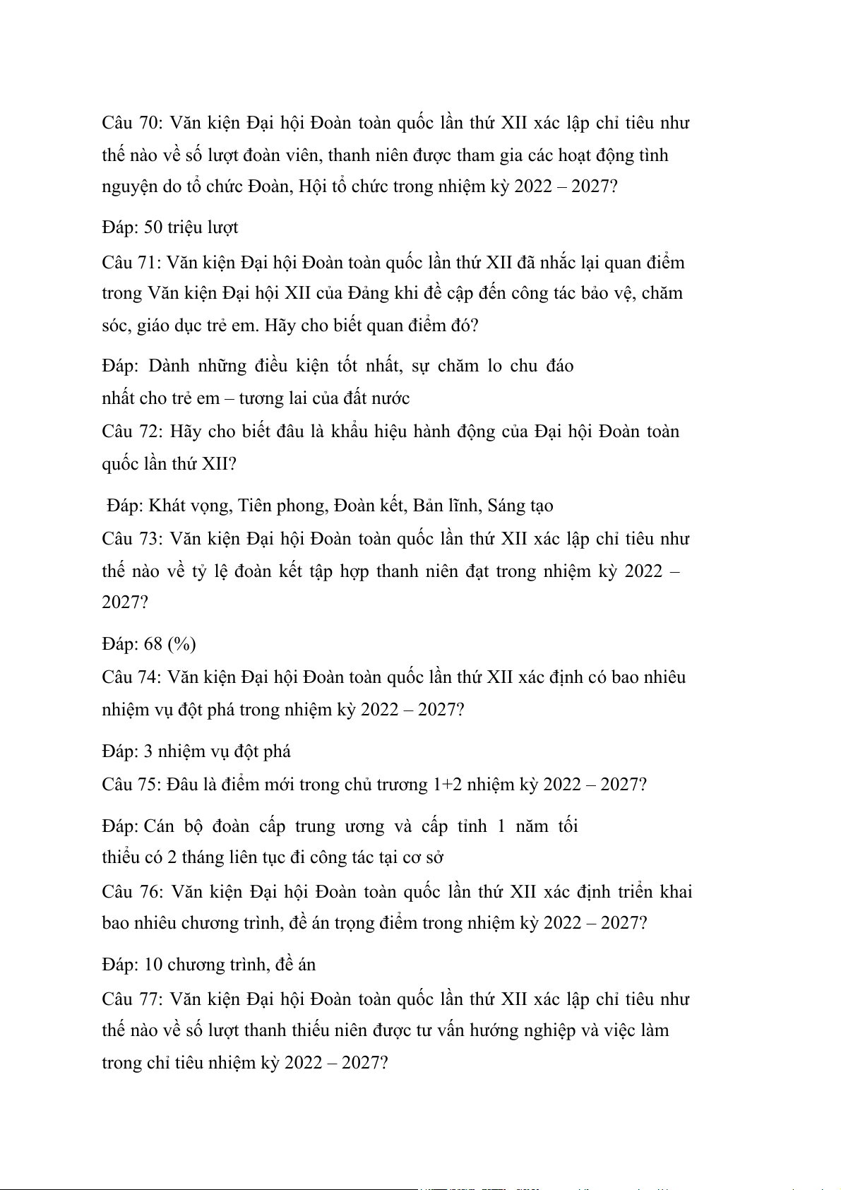 Câu 74: Văn kiện Đại hội Đoàn toàn quốc lần thứ XII xác định có bao nhiêu