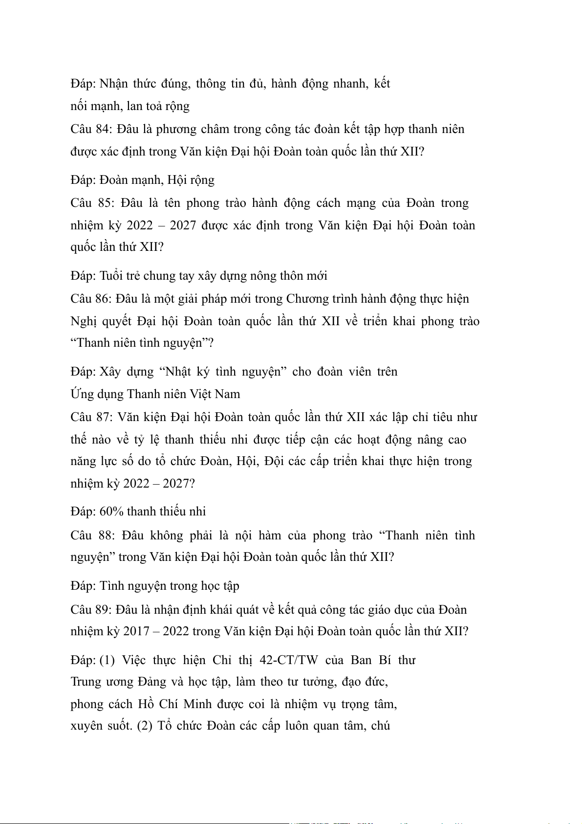 năng lực số do tổ chức Đoàn, Hội, Đội các cấp triển khai thực hiện trong nhiệm kỳ 2022 – 2027? Đáp: 60% thanh thiếu nhi Câu 88: Đâu