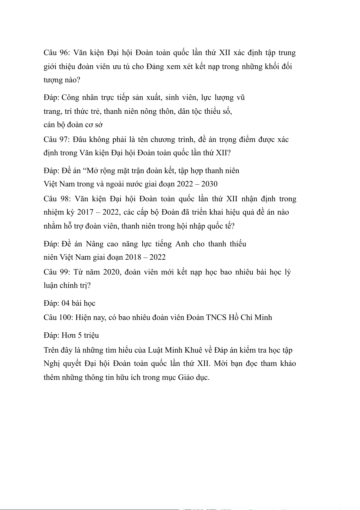 Câu 100: Hiện nay, có bao nhiêu đoàn viên Đoàn TNCS Hồ Chí Minh Đáp: Hơn 5 triệu