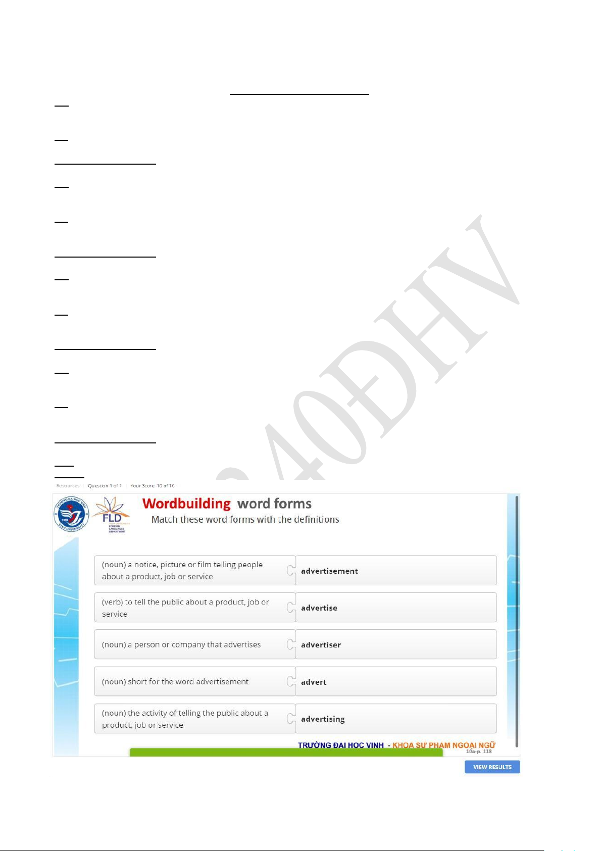 E-learning VinhUni Tiếng Anh 2 6A. 1. To save 2. To meet 3. To have 4. Going 5. To tel 6. To move 7. Driving 8. To see 9. To listen 10. To do 6B. 1. Are going to (1) 2. ‘ll buy 3. ‘ll find 4. ‘ll check 5. Are you leaving