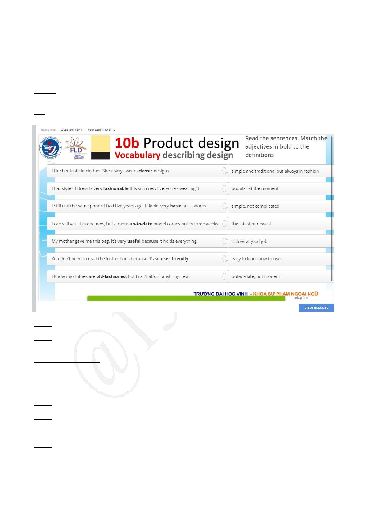 Listening pratice unit 9. 1. She didn’t… 2. tiring 3. on his walking… 4. her daughter 5. at a… 10A. Quiz 1. @1340ĐHV @1340ĐHV @1340ĐHV @1340ĐHV Quiz 2. 1. Produce 2. products 3. producers 4. production 5. productive Quiz 3.