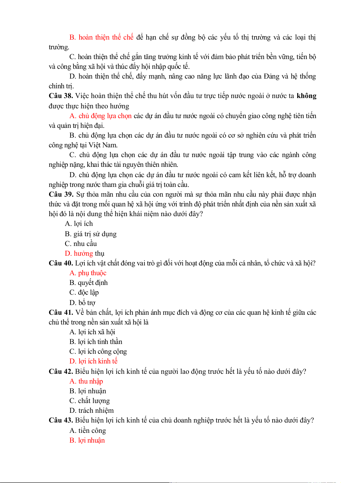 Câu 43. Biểu hiện lợi ích kinh tế của chủ doanh nghiệp trước hết là yếu tố nào dưới đây? A. tiền công B. lợi nhuận C. thu nhập D. trách nhiệm