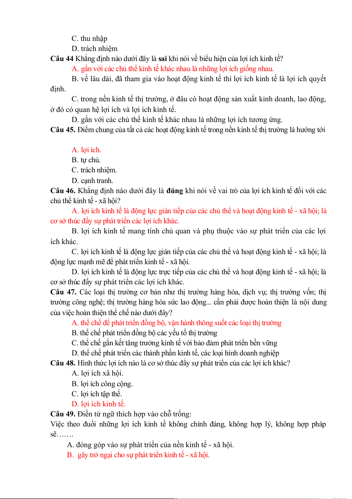 Câu 45. Điểm chung của tất cả các hoạt động kinh tế trong nền kinh tế thị trường là hướng tới A. lợi ích. B. tự chủ. C. trách nhiệm. D. cạnh tranh.
