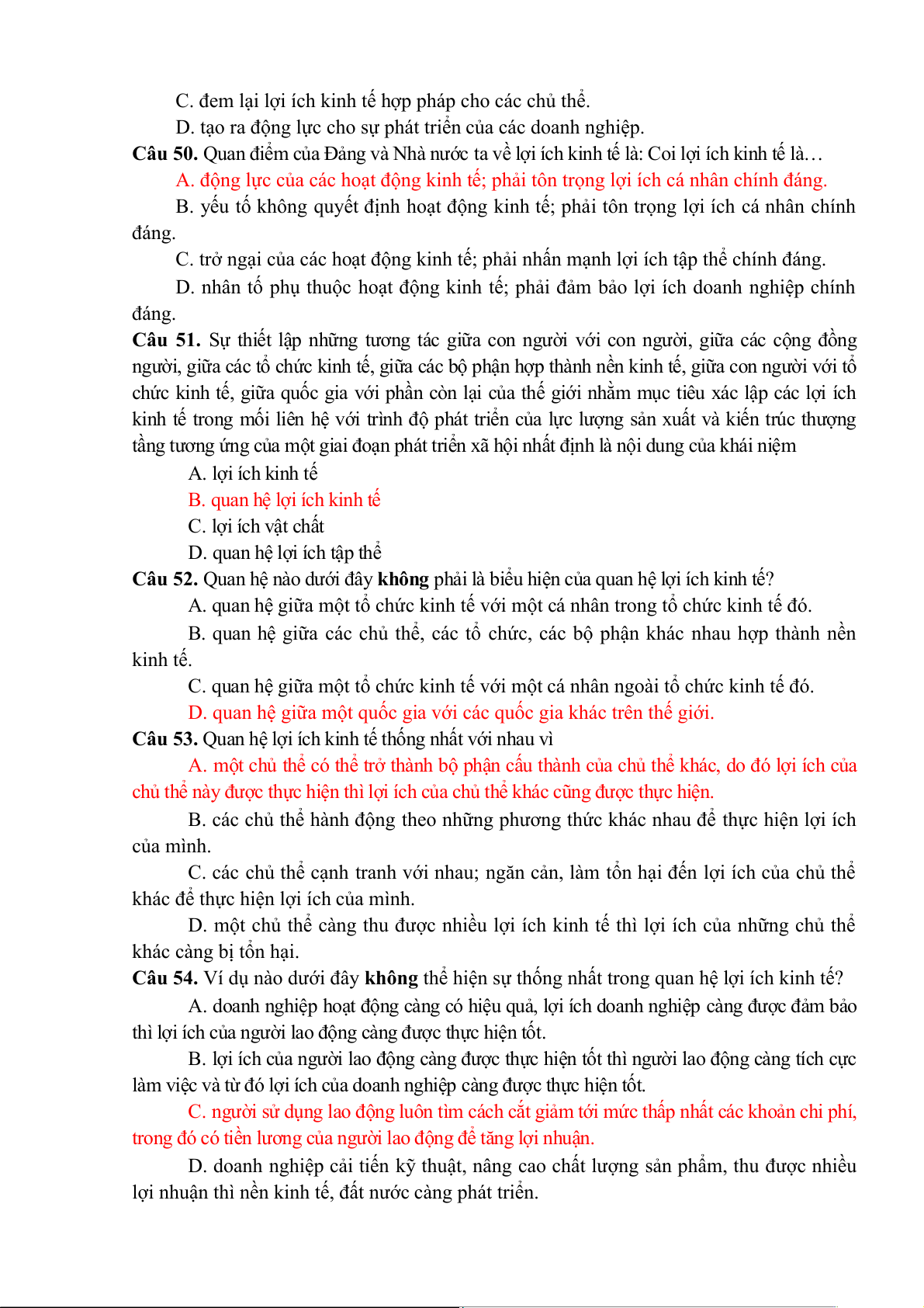 Câu 50. Quan điểm của Đảng và Nhà nước ta về lợi ích kinh tế là: Coi lợi ích kinh tế là…