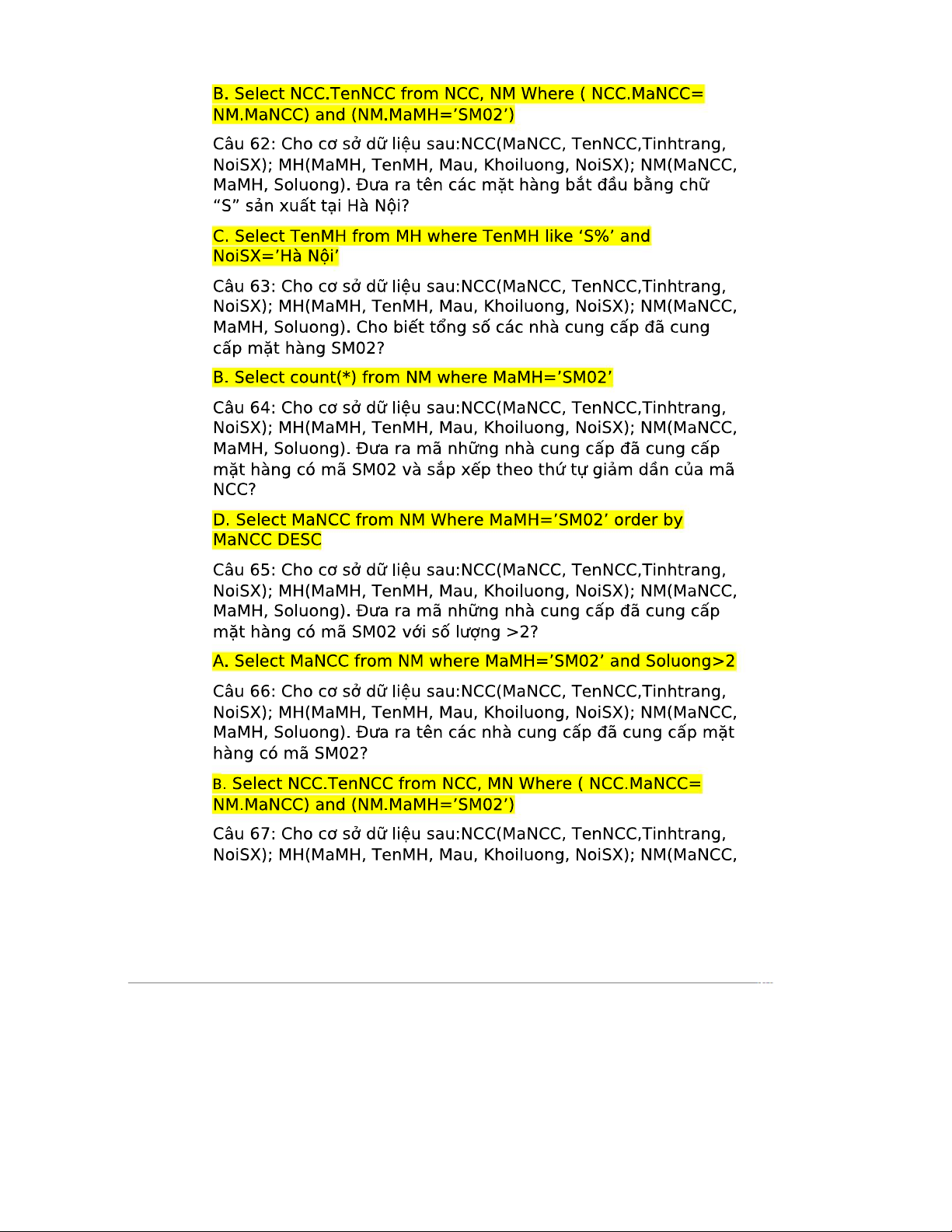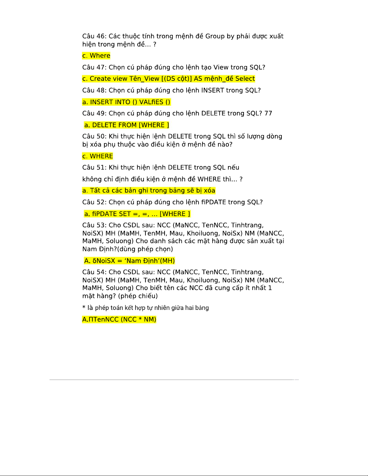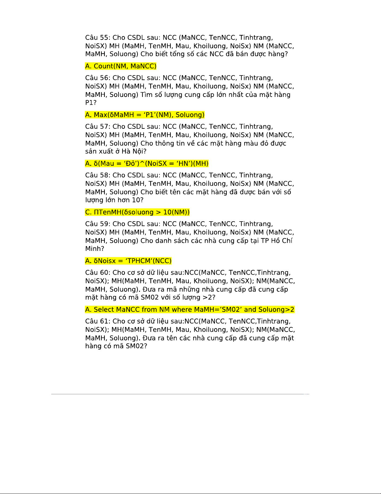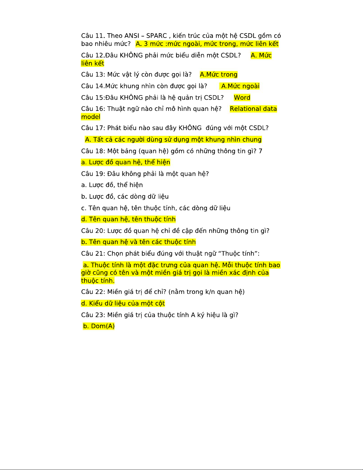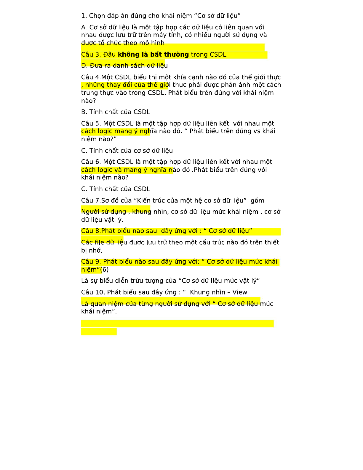 Đáp án trắc nghiệm môn CSDL - Cơ sở dữ liệu học kỳ này