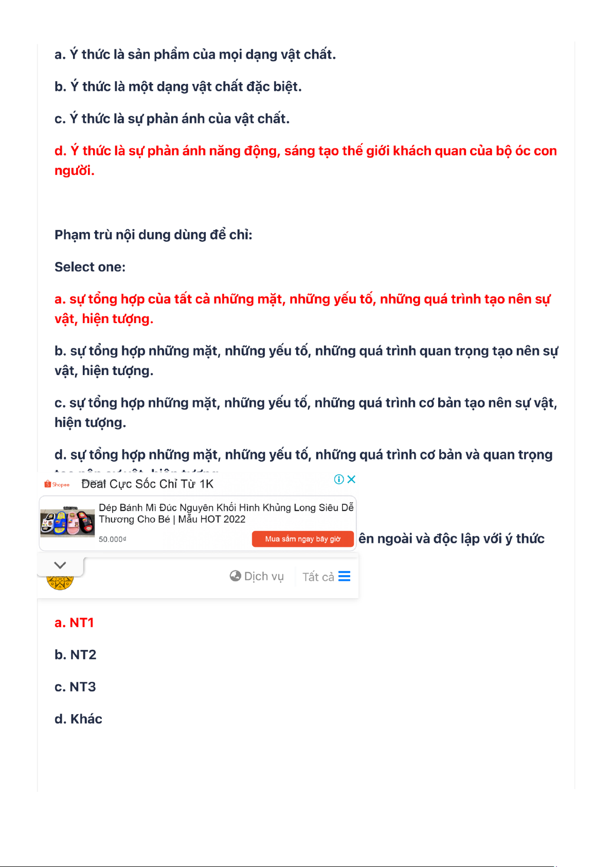 d. ý thức không phải là một hiện thực.