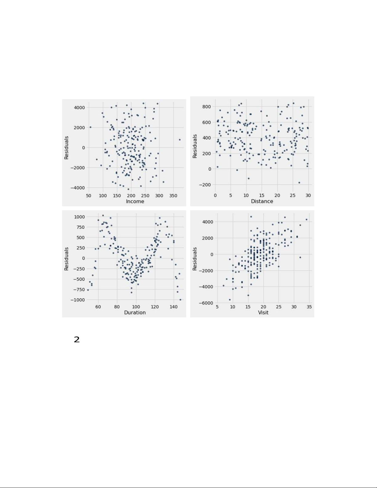 i. (2.0 pt) Which of the plots above indicate that the variable is linearly associated with guest spend? Select all that apply. Income Distance Du 2 ration Vis 2 it 2 2 None of the above.