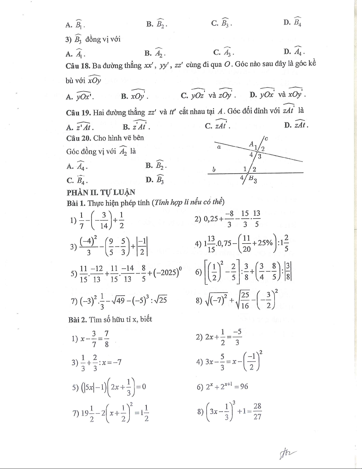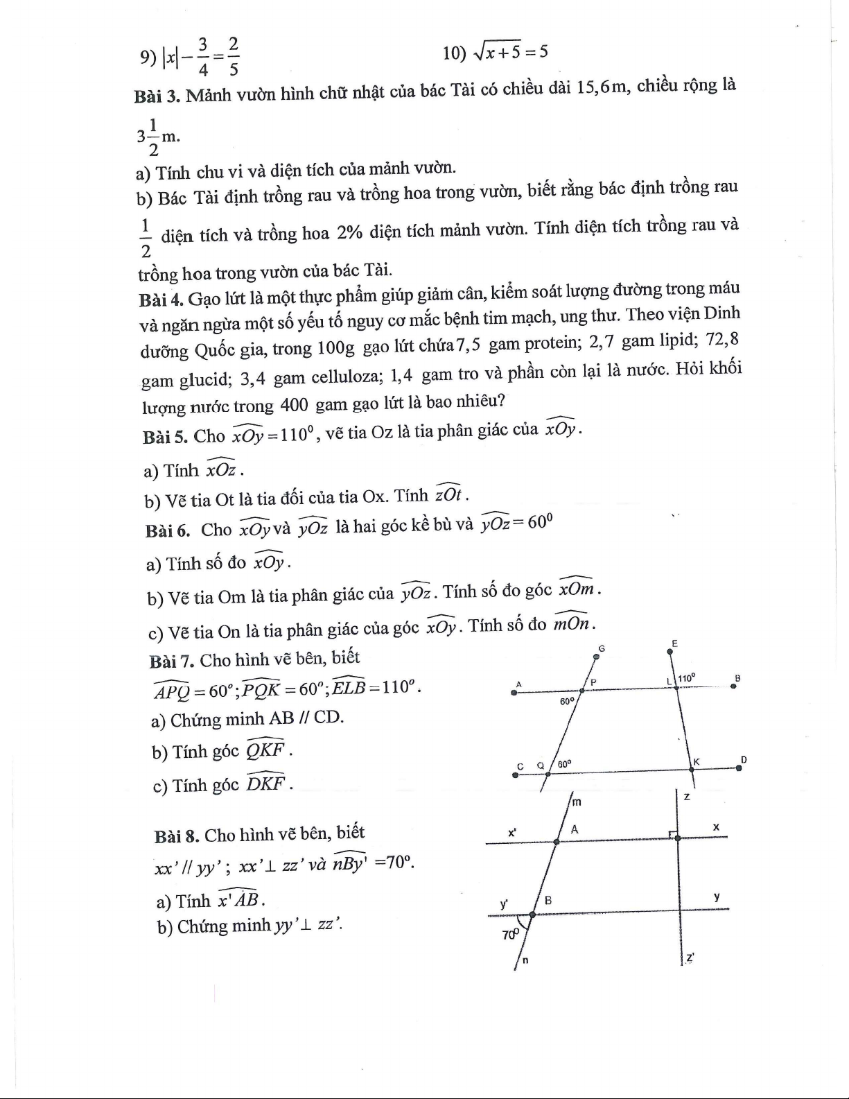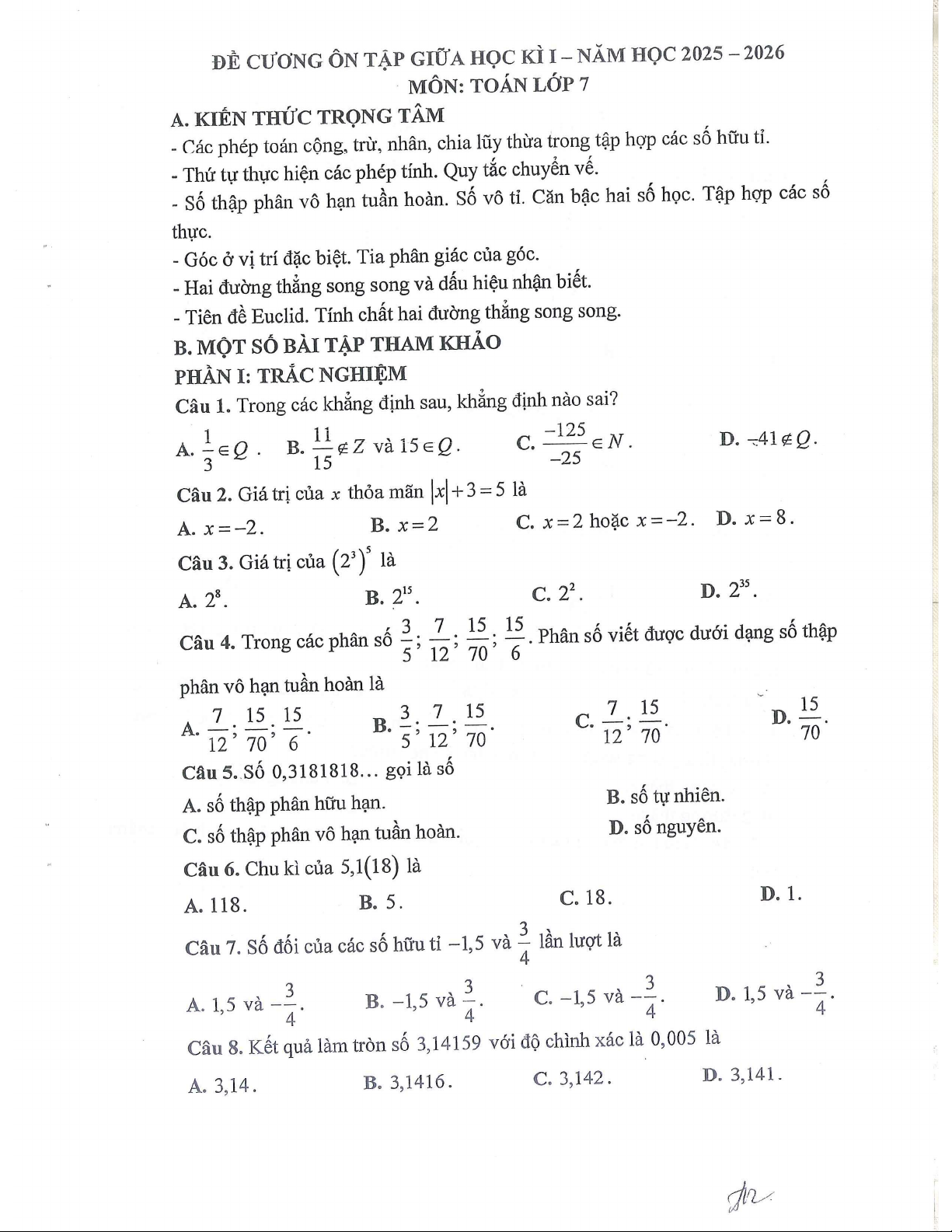 Đề cương giữa kì 1 môn Toán lớp 7