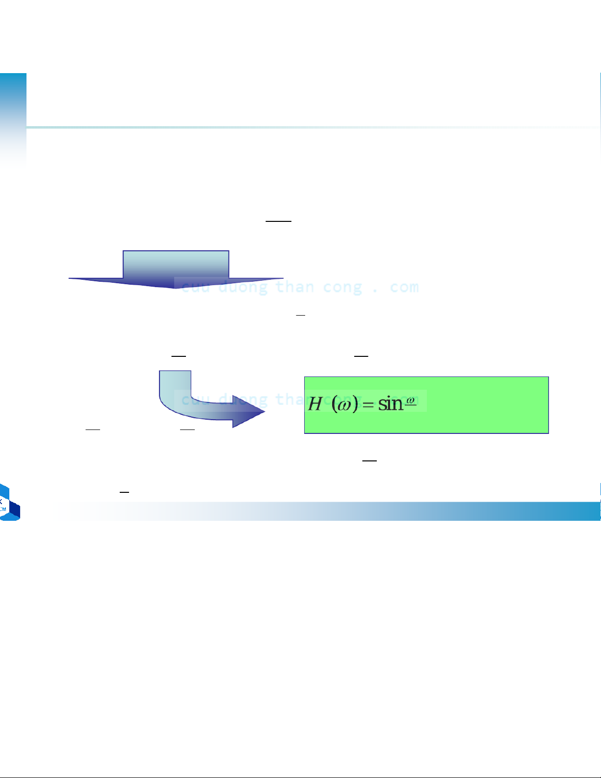 •Trường hợp 3: đáp ứng xung đơn vị phản đối xứng và M lẻ − ( =3)/ 2 ( )sin ( ω ∑ −− 021) M rn ω n = k = (M-1)/2 – n − ( =) 1 / 2 ( ) M ( k rk ω ∑1)sin ω k= 21 ) ,1 , 2 21, c'( 2 M 3 − ) = c( 2 M 1 − )
