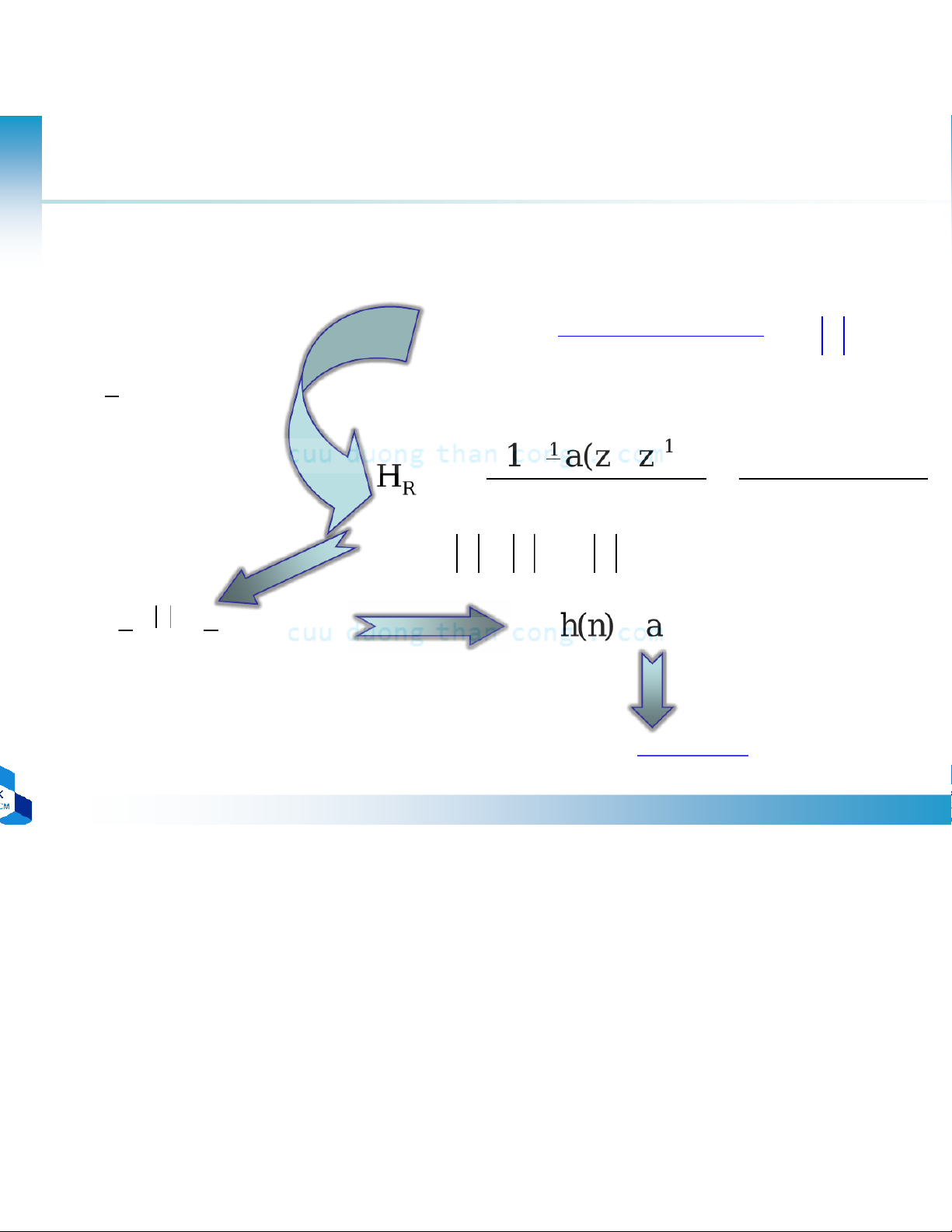 h(n) có năng lượng hữu hạn ln H ( ω ) ω d < ∞ ∫ h(n) = 0 ∀n<0 −π π ∫ ln H ω ( ) ω d < ∞ Voi ( Θ=), ωω ( H ) H −π π ( h )n : nhân qua ∫ H ω 2 ( ) ω d < ∞ −π