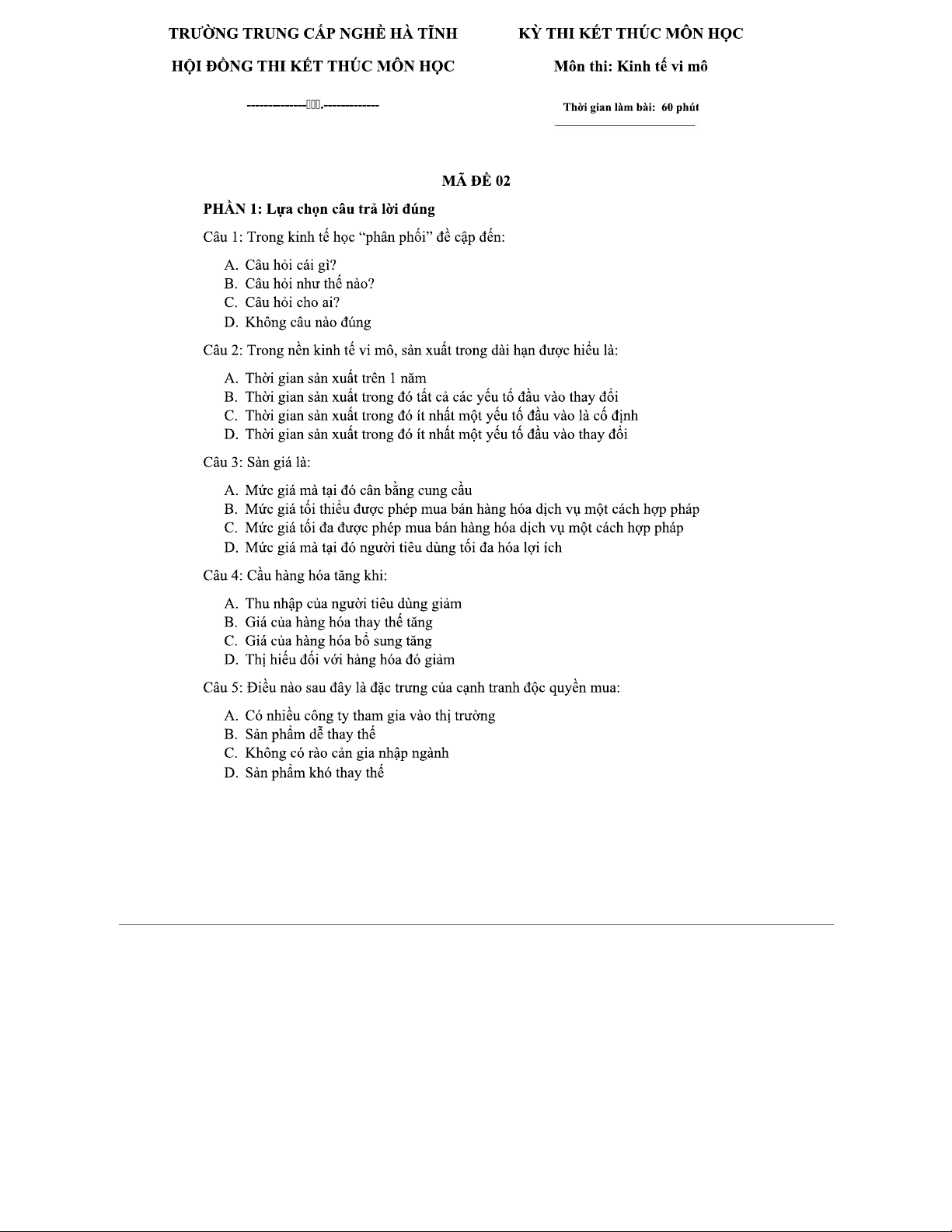 ĐỀ 02 - Kiểm Tra Trắc Nghiệm Kinh Tế Vi Mô - Kỳ Thi Cuối Học Phần