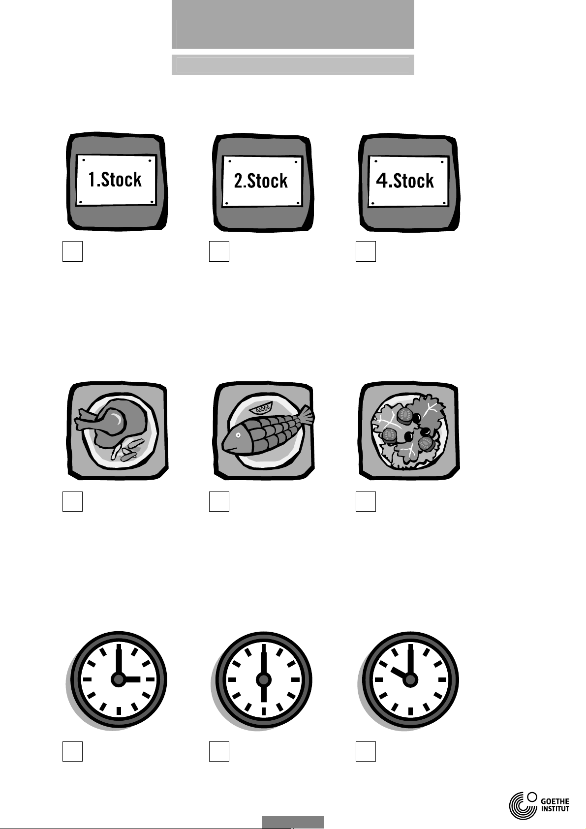 1 Wo gibt es Kleidung für Kinder? a Im 1. Stock. b Im 2. Stock. c Im 4. Stock. 2 Was bestellt die Dame? a Hähnchen. b Fisch. c Salat.