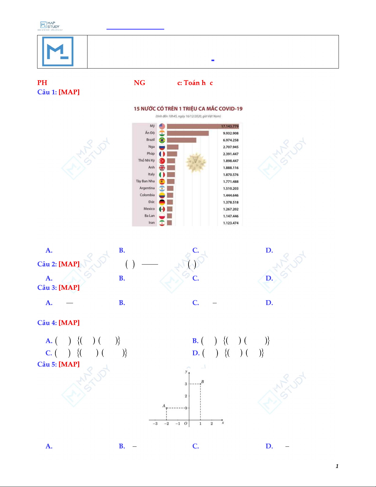 Tính đến ngày 16/12/2020 Quốc gia nào có số ca mắc Covid 19 – nhiều nhất thế giới? Ấn Độ Trung Quốc Thổ Nhĩ Kỳ Mỹ Cho hàm số 1 f x . Tính f 1 2x 1 −8 −2 2 8