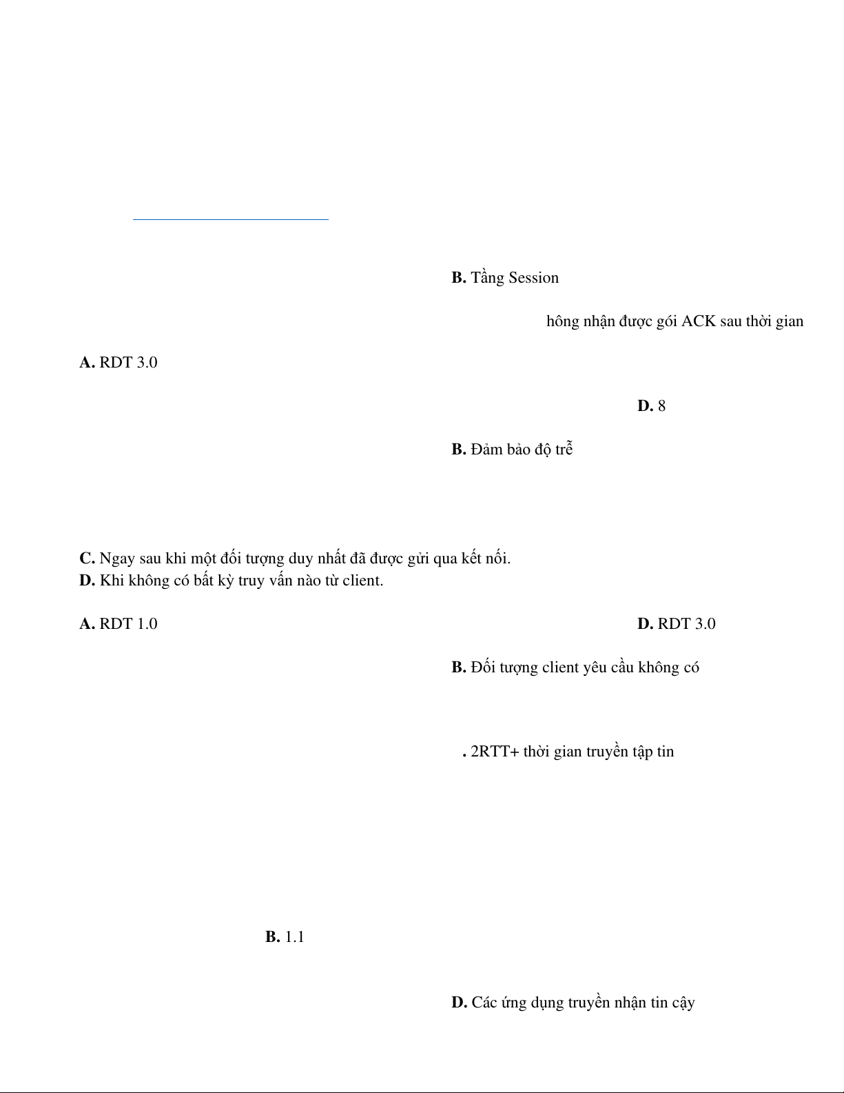 Câu 2. Trong giao thức RDT, phiên bản nào thực hiện gửi lại gói tin nếu không nhận được gói ACK sau thời gian chờ của nó? A. RDT 3.0 B. RDT 2.2 C. RDT 2.1 D. RDT 1.0