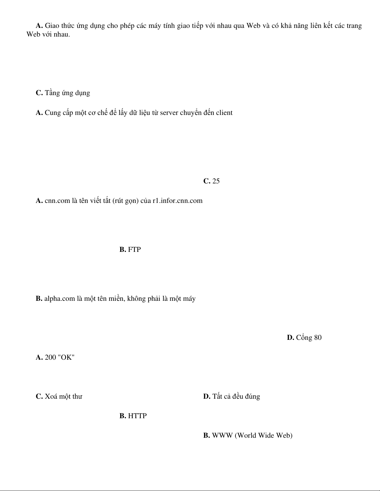 Câu 18. Web server thường sử dụng phần mềm chạy trên: A. Cổng 25 B. Cổng 404 C. Cổng 125 D. Cổng 80