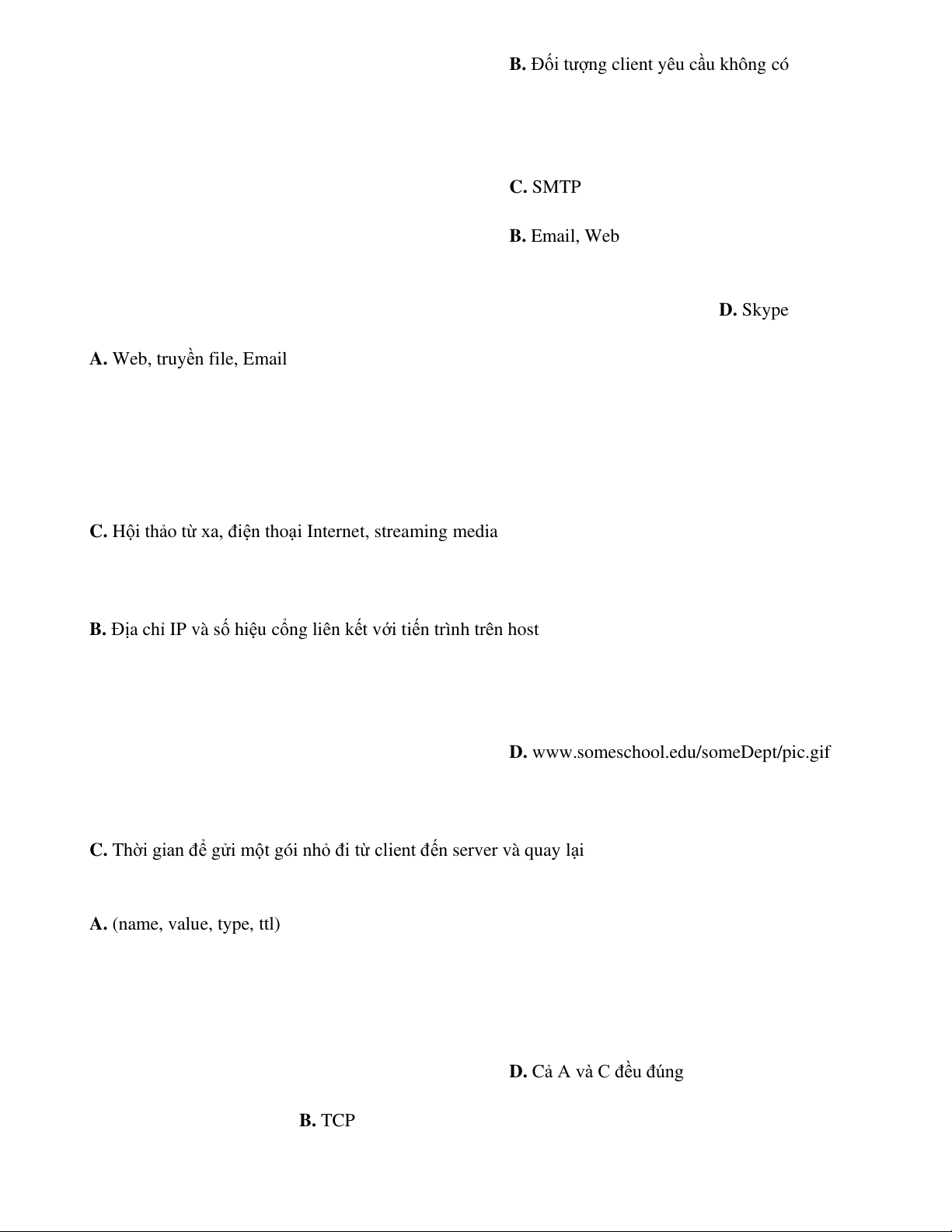 Câu 25. Ứng dụng nào sử dụng mô hình client/server: A. Bit Torrent B. Email, Web C. Skype D. KaZaA
