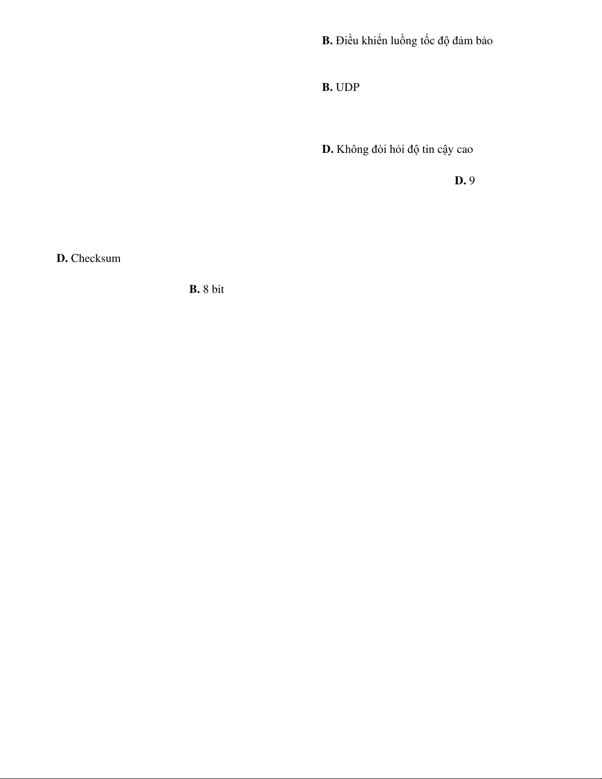 Câu 38. Trong gói dữ liệu UDP (UDP segment), vùng dữ liệu thực sự bắt đầu từ byte thứ: A. 4 B. 5 C. 8 D. 9