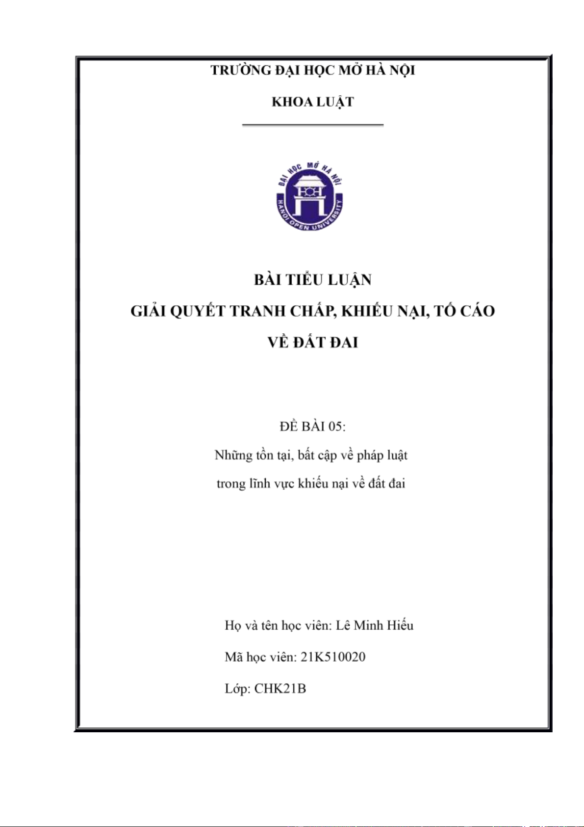 tôi chọn đề tài “Những tồn tại, bất cập về pháp luật trong lĩnh vực khiếu nại về đất đai”. lOMoAR cPSD| 59908026 NỘI DUNG