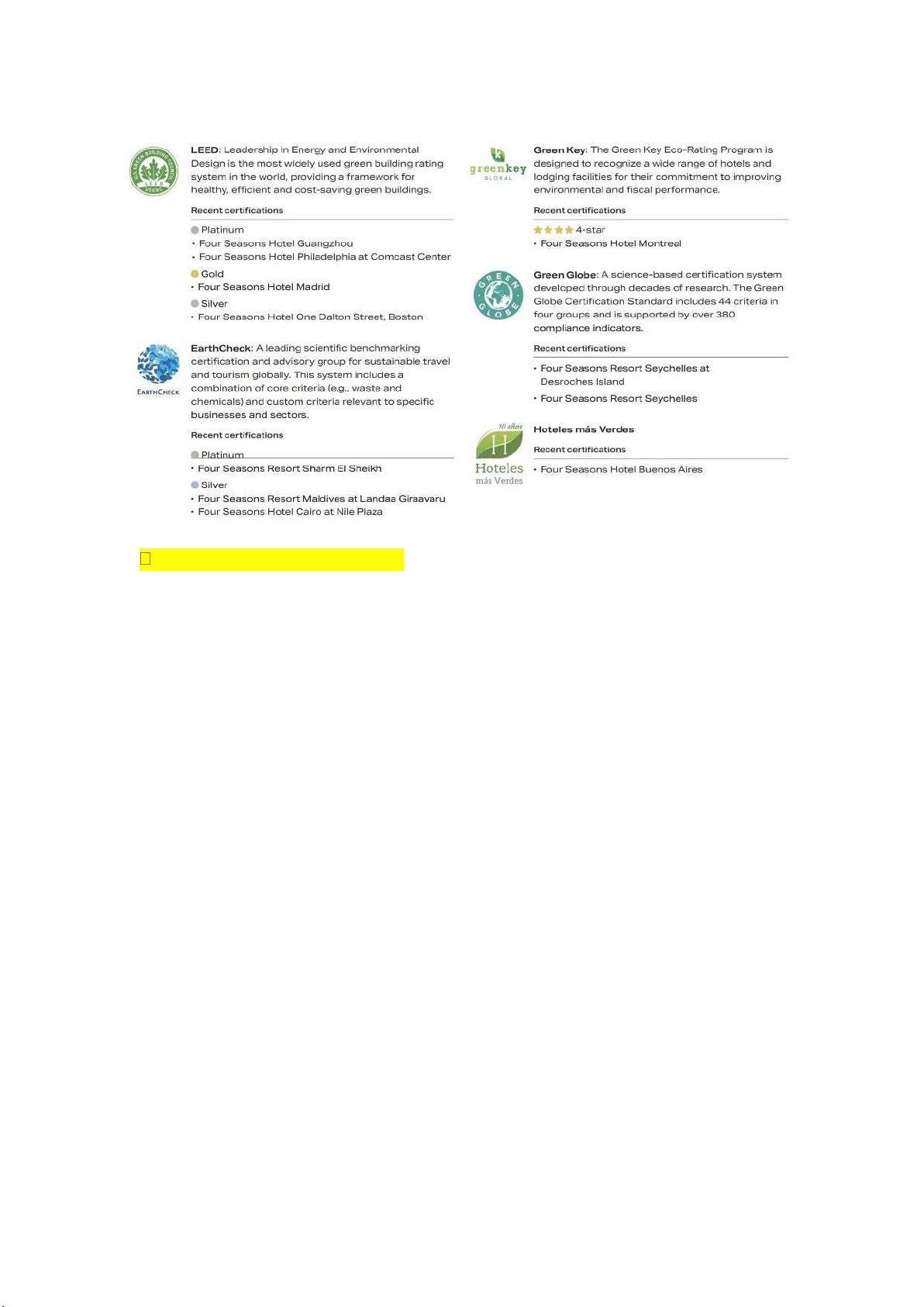 LEED, ISO 14001, chứng nhận EcoHotel, hoặc Green Key. Họ thể hiện sự cam kết đối với