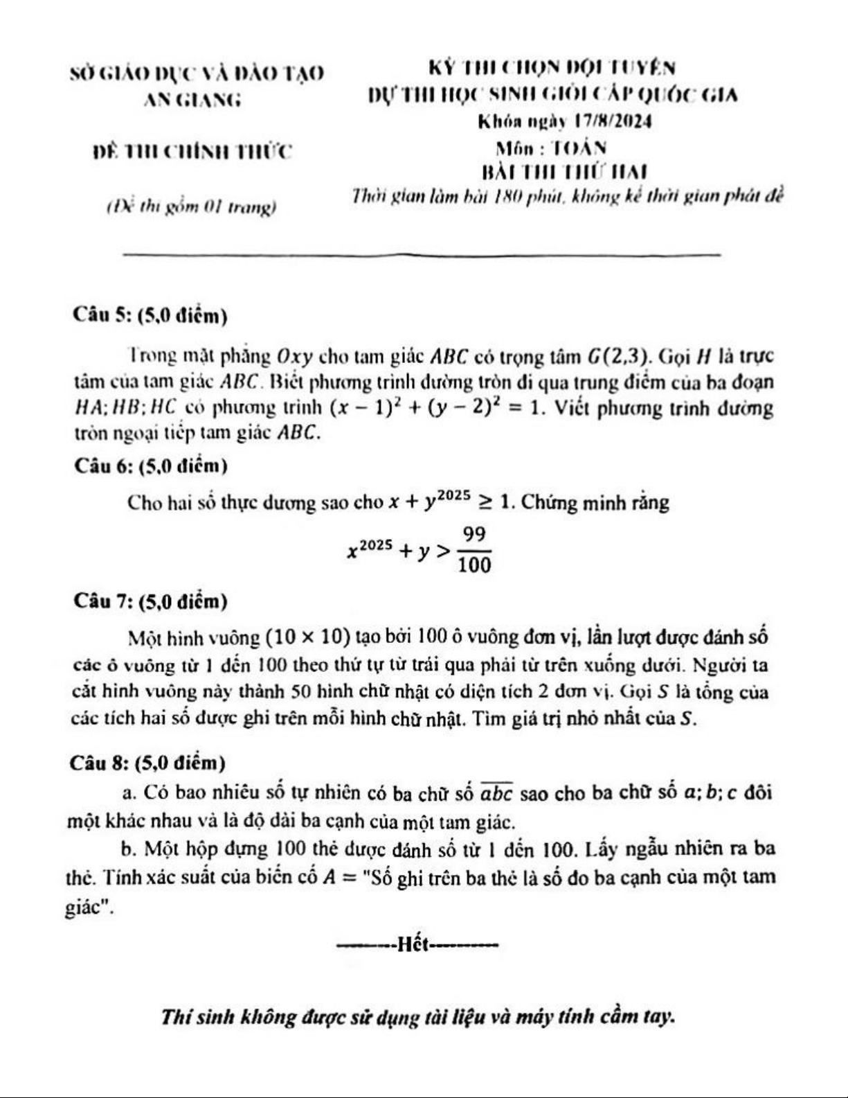 Đề chọn đội tuyển thi HSG QG môn Toán THPT năm 2024 – 2025 sở GD&ĐT An Giang