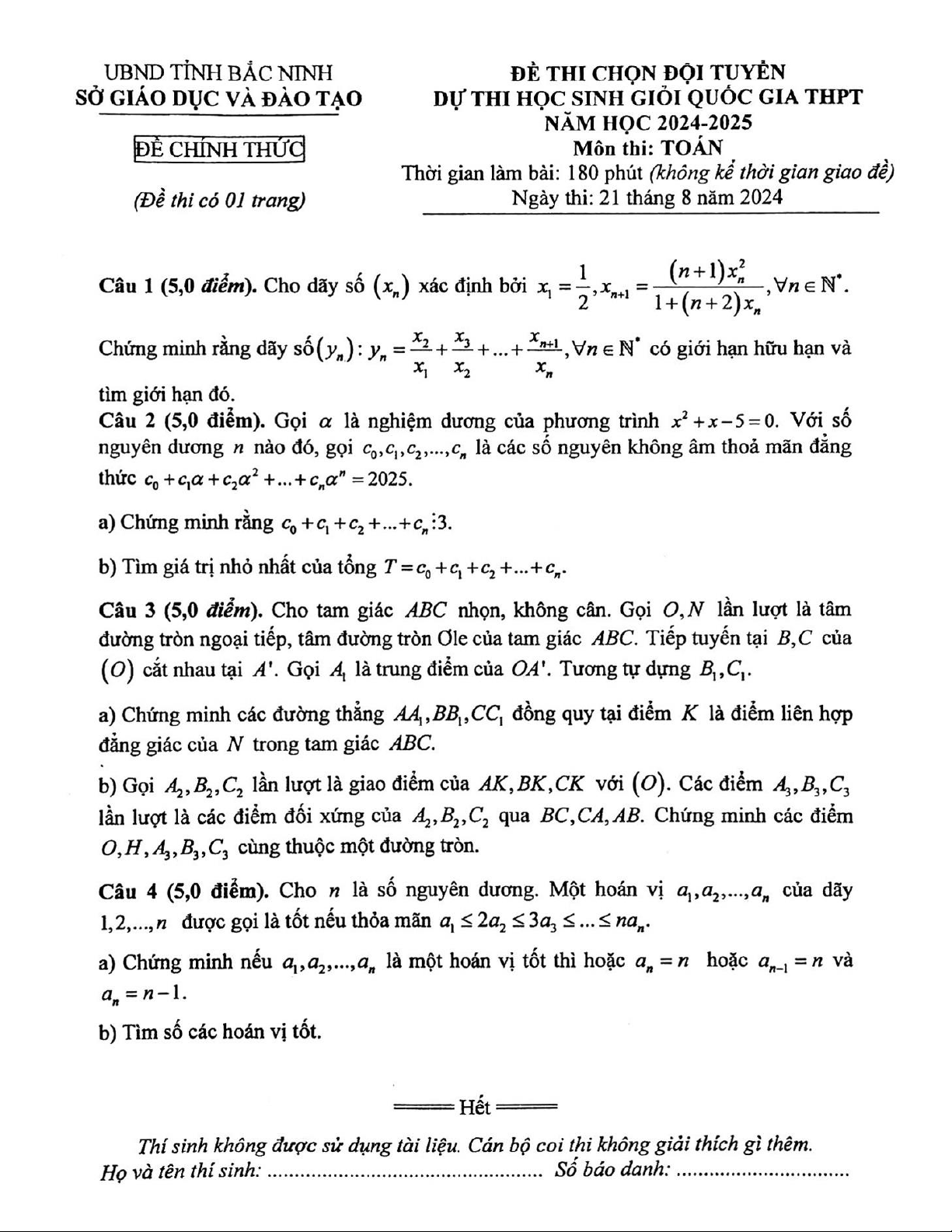 giới thiệu đến quý thầy, cô giáo và các em học sinh lớp 12 đề thi chọn đội tuyển dự thi học sinh giỏi Quốc gia môn Toán THPT năm học 2024 – 2025 sở Giáo dục và Đào tạo tỉnh Bắc Ninh; kỳ thi được diễn ra vào ngày 21 tháng 08 năm 2024. Mời bạn đọc đón xem!