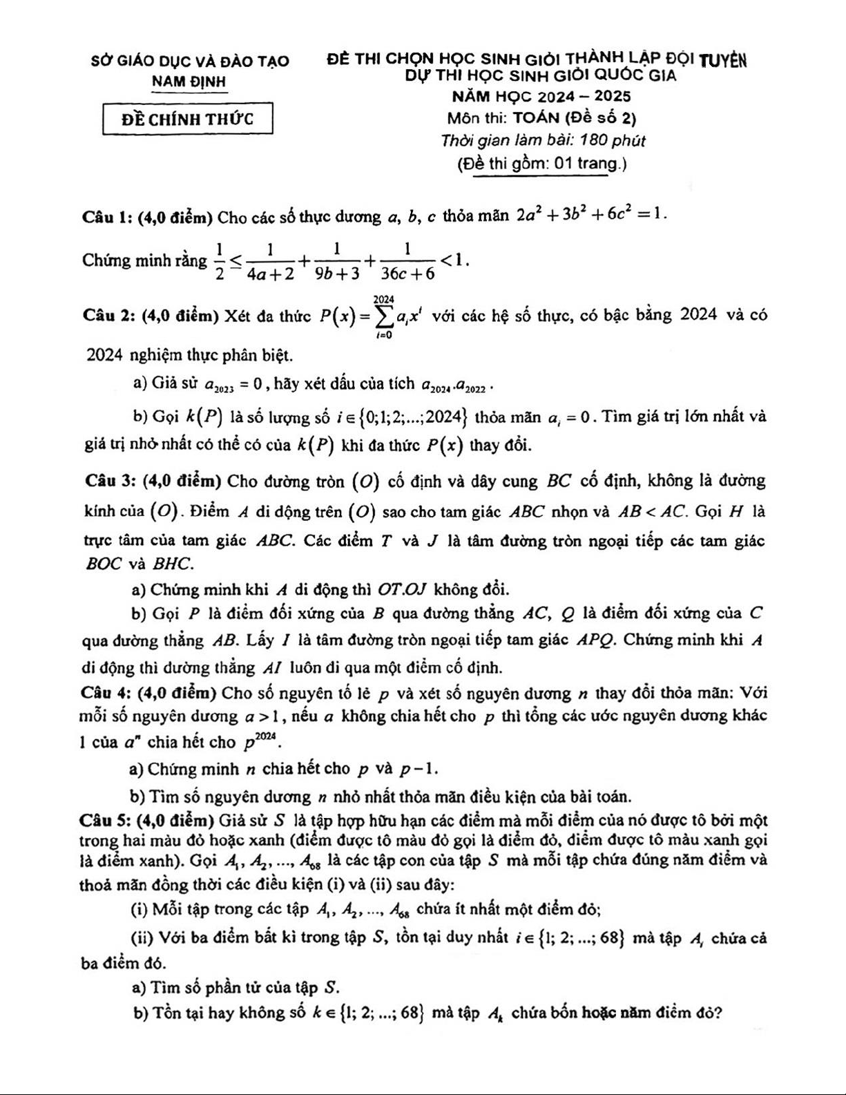 Đề chọn đội tuyển thi HSG QG môn Toán THPT năm 2024 – 2025 sở GD&ĐT Nam Định