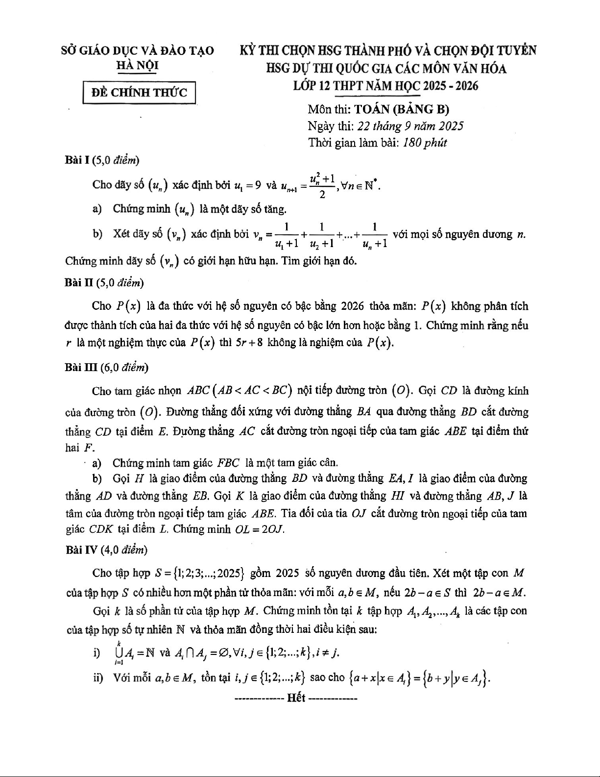 Giới thiệu đến quý thầy, cô giáo và các em học sinh đề chính thức kỳ thi chọn học sinh giỏi thành phố và chọn đội tuyển học sinh giỏi dự thi Quốc gia môn Toán 12 THPT năm học 2025 – 2026 sở Giáo dục và Đào tạo thành phố Hà Nội (Bảng B). Kỳ thi được diễn ra vào ngày 22 và ngày 23 tháng 09 năm 2025.