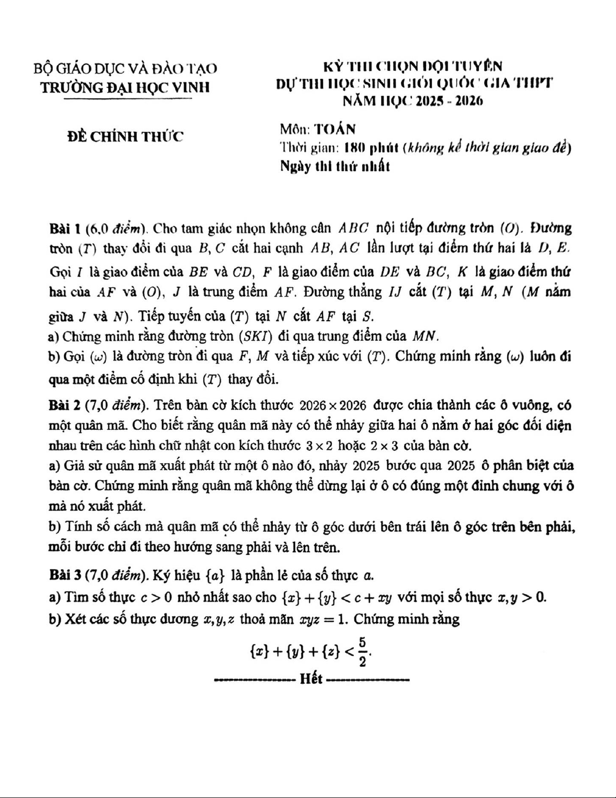 Giới thiệu đến quý thầy, cô giáo và các em học sinh đề chính thức kỳ thi chọn đội tuyển dự thi học sinh giỏi Quốc gia môn Toán THPT năm học 2025 – 2026 trường THPT chuyên Đại học Vinh, tỉnh Nghệ An.