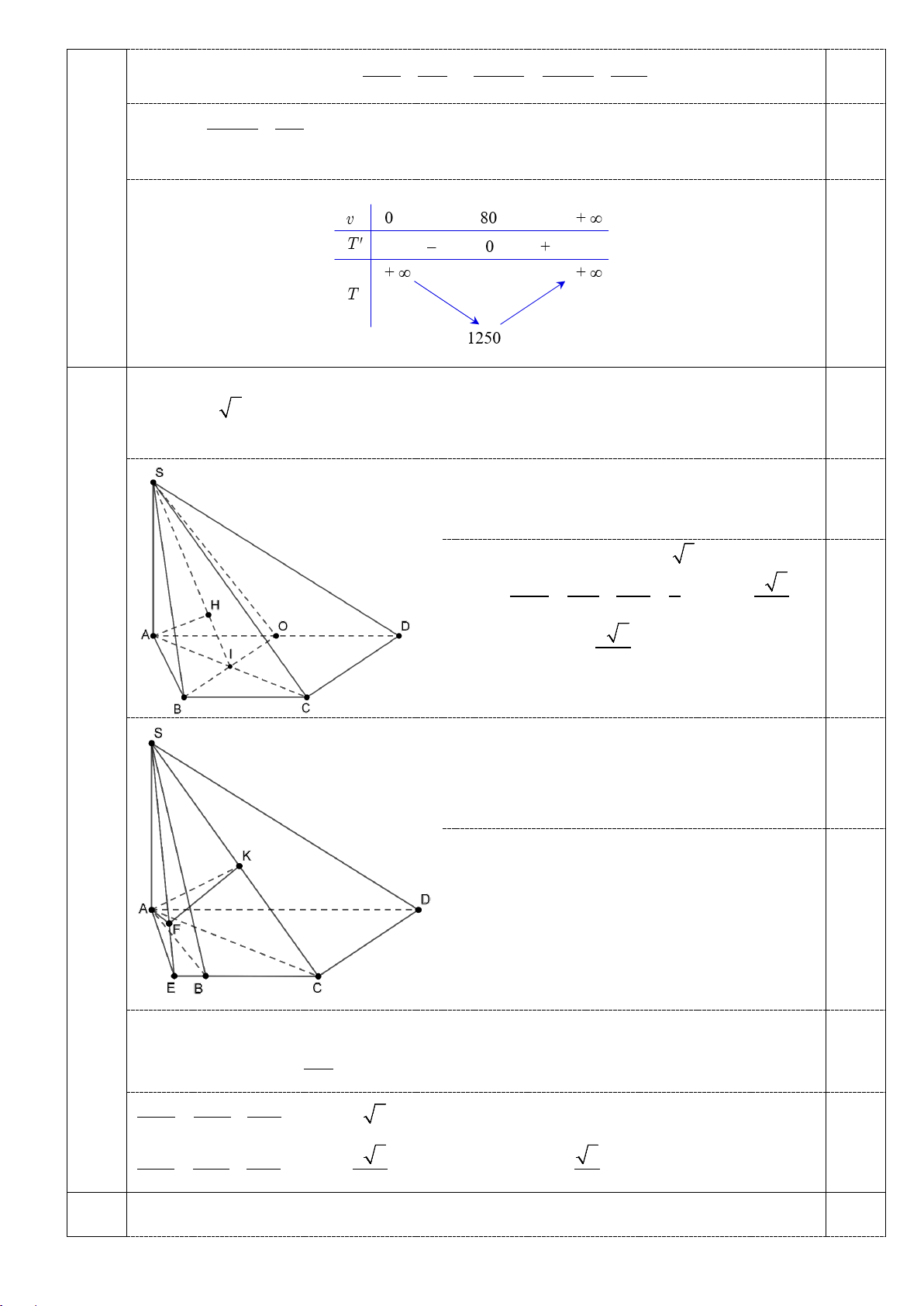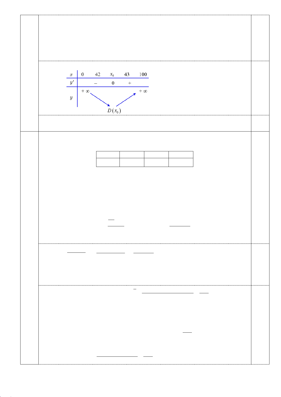 Thời gian dập tắt tại khu A và khu B lần lượt là 100 t = ; 100 t = . A x B 100 − x 0,5 3 4 6 8 Tổng thiệt hại là 100 100 2.10 3.10 D = 2 + 3 = + . 3 x 100 − x x (100− x)4 6 8 6.10 12.10 D′ = − + . 4 5 x (100 − x) 0,25 6 8 6.10 12.10 4 5 D′ = 0 ⇔ =