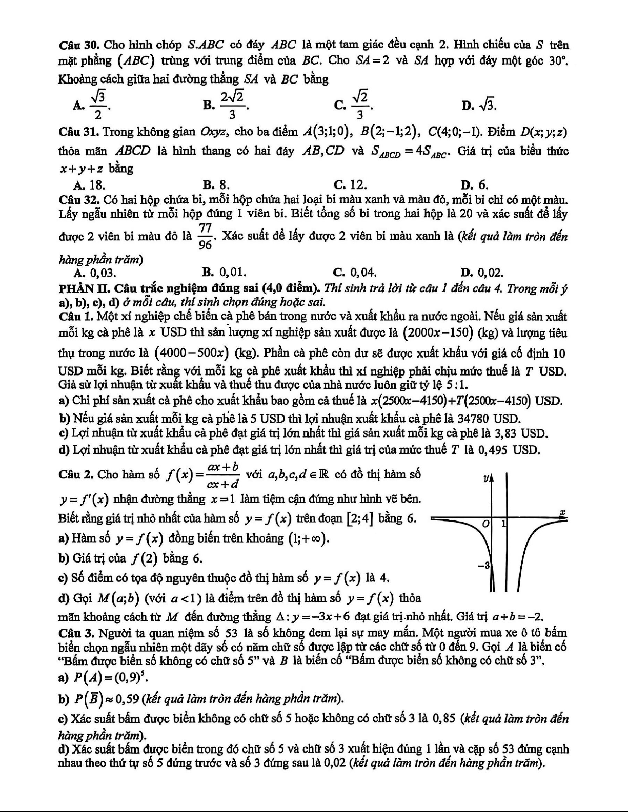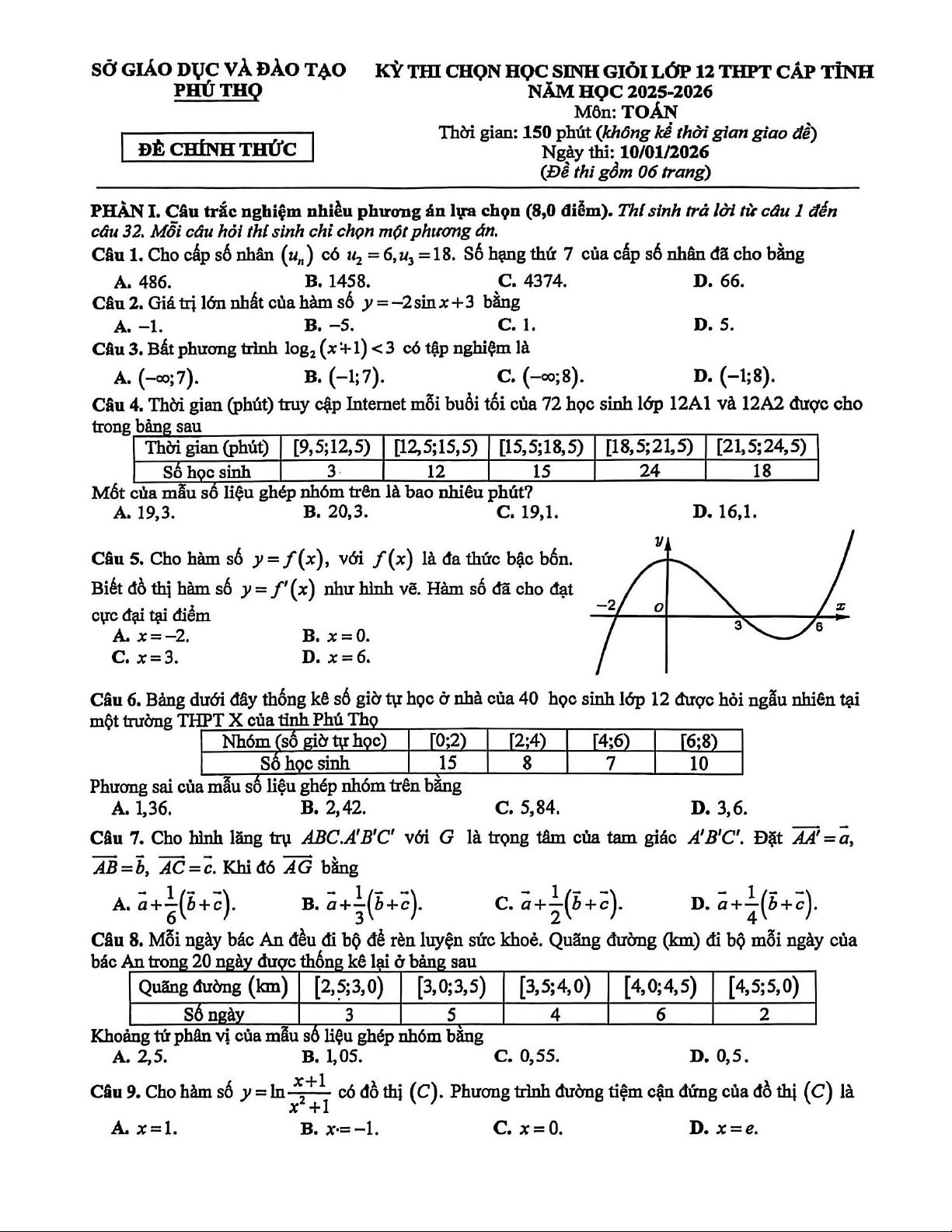 Xin giới thiệu đến quý thầy, cô giáo và các em học sinh đề thi chọn học sinh giỏi cấp tỉnh môn Toán 12 THPT năm học 2025 – 2026 sở Giáo dục và Đào tạo tỉnh Phú Thọ. Đề thi gồm 32 câu trắc nghiệm nhiều phương án lựa chọn (8,0 điểm) + 04 câu trắc nghiệm đúng sai (4,0 điểm) + 06 câu trắc nghiệm trả lời ngắn (3,0 điểm) + 03 câu tự luận (5,0 điểm), thời gian làm bài 90 phút. Kỳ thi được diễn ra vào ngày 10 tháng 01 năm 2026.