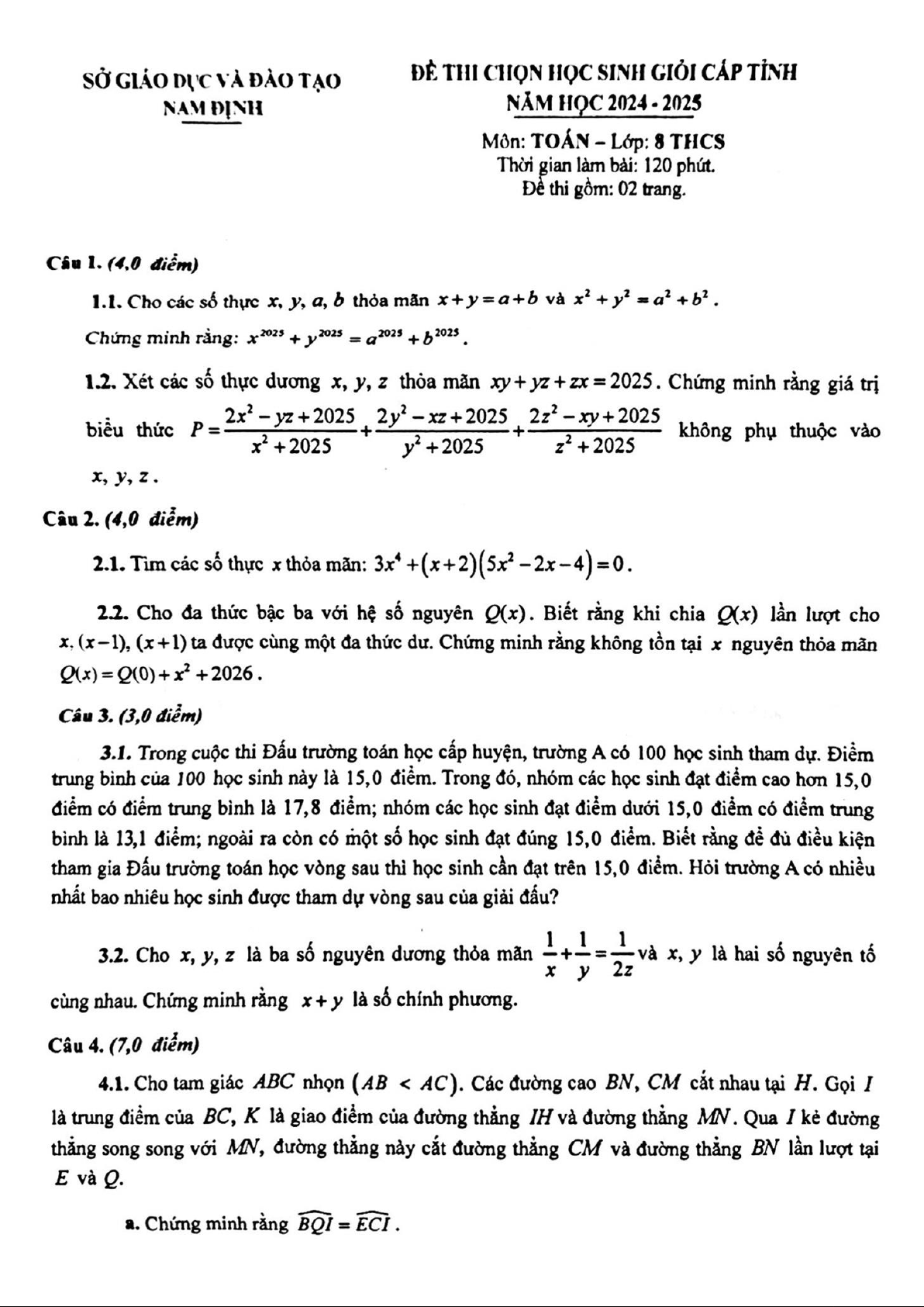 Giới thiệu đến quý thầy, cô giáo và các em học sinh lớp 8 đề thi chọn học sinh giỏi cấp tỉnh môn Toán 8 THCS năm học 2024 – 2025 sở Giáo dục và Đào tạo tỉnh Nam Định.