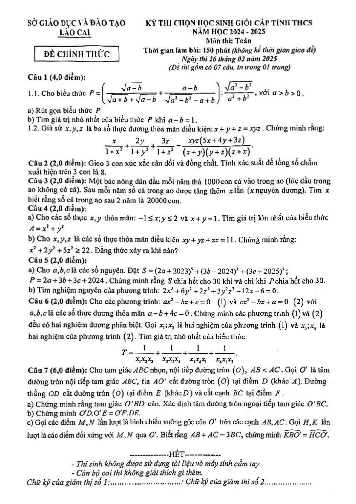 Giới thiệu đến quý thầy, cô giáo và các em học sinh lớp 9 đề thi chọn học sinh giỏi cấp tỉnh môn Toán bậc THCS năm học 2024 – 2025 sở Giáo dục và Đào tạo tỉnh Lào Cai. Kỳ thi được diễn ra vào ngày 26 tháng 02 năm 2025.