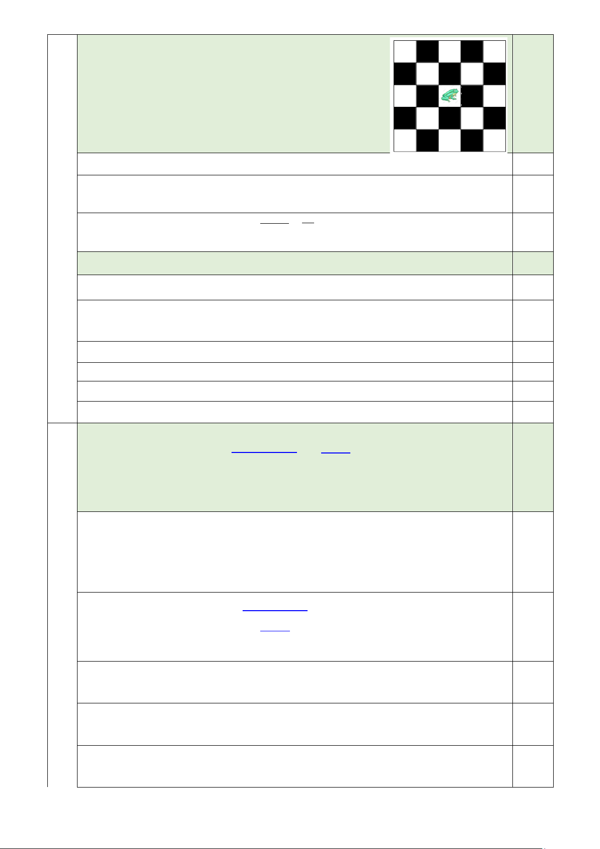 a) Một con ếch đang ở giữa một bảng có 5× 5 ô vuông được tô hai màu