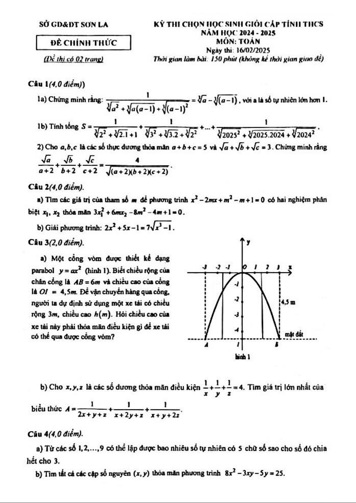 Giới thiệu đến quý thầy, cô giáo và các em học sinh lớp 9 đề chính thức kỳ thi chọn học sinh giỏi cấp tỉnh môn Toán THCS năm học 2024 – 2025 sở Giáo dục và Đào tạo tỉnh Sơn La. Đề thi gồm 02 trang, hình thức tự luận với 05 bài toán, thời gian làm bài 150 phút. Kỳ thi được diễn ra vào ngày 16 tháng 02 năm 2025.