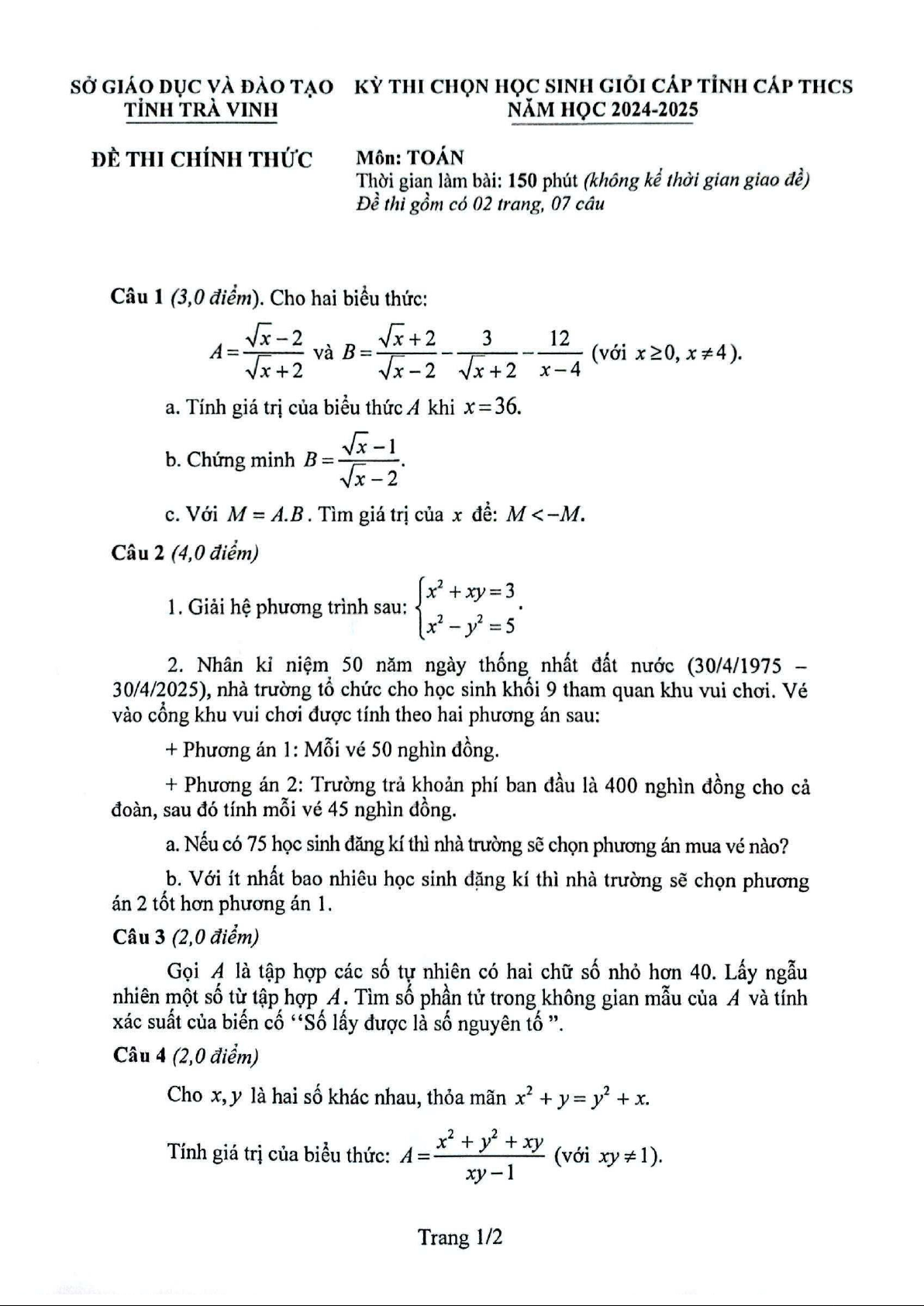 Giới thiệu đến quý thầy, cô giáo và các em học sinh lớp 9 đề thi chọn học sinh giỏi cấp tỉnh môn Toán THCS năm học 2024 – 2025 sở Giáo dục và Đào tạo tỉnh Trà Vinh.