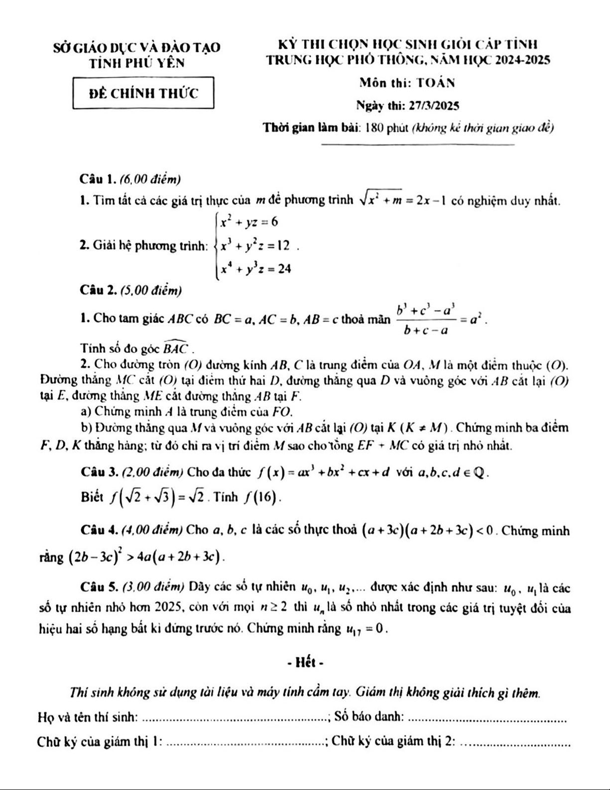 Giới thiệu đến quý thầy, cô giáo và các em học sinh lớp 12 đề thi chọn học sinh giỏi cấp tỉnh môn Toán THPT năm học 2024 – 2025 sở Giáo dục và Đào tạo tỉnh Phú Yên. Kỳ thi được diễn ra vào ngày 27 tháng 03 năm 2025.