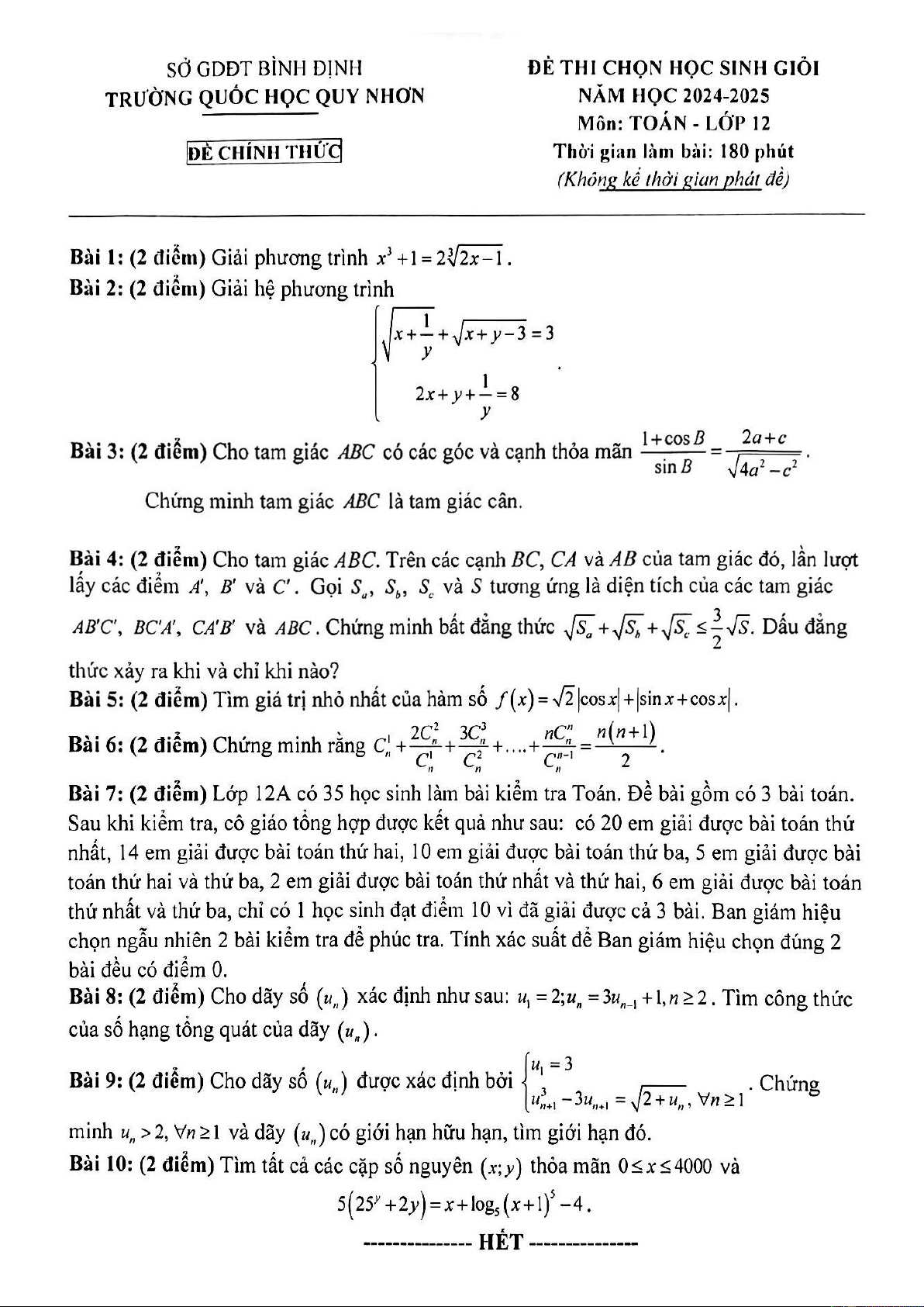 Xin giới thiệu đến quý thầy, cô giáo và các em học sinh lớp 12 đề thi chọn học sinh giỏi môn Toán 12 năm học 2024 – 2025 trường Quốc Học Quy Nhơn, tỉnh Bình Định. Đề thi gồm 01 trang, hình thức tự luận với 10 bài toán, thời gian làm bài 180 phút. Mời bạn đọc đón xem!
