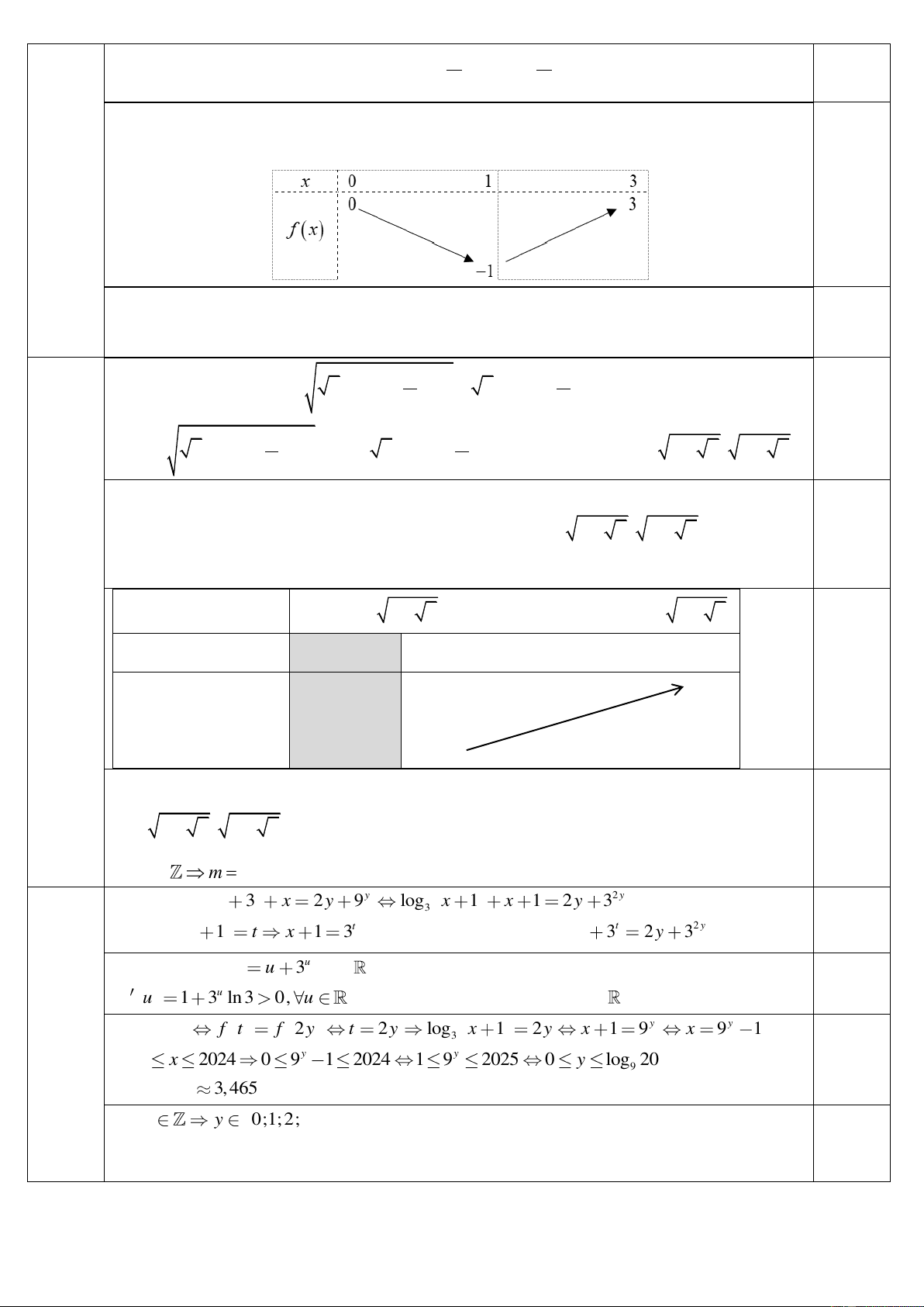 nên hàm số f u đồng biến trên . Câu 10 Do đó 2 f t f 2 y t 2 y log 1 2 1 9y 9y x y x x 1 (2,0 đ) 3 Vì 0 2024 0 9y 1 2024 1 9y x 2025 0 y log 2025 0,5 9 log 2025 3, 465 9 Do y y