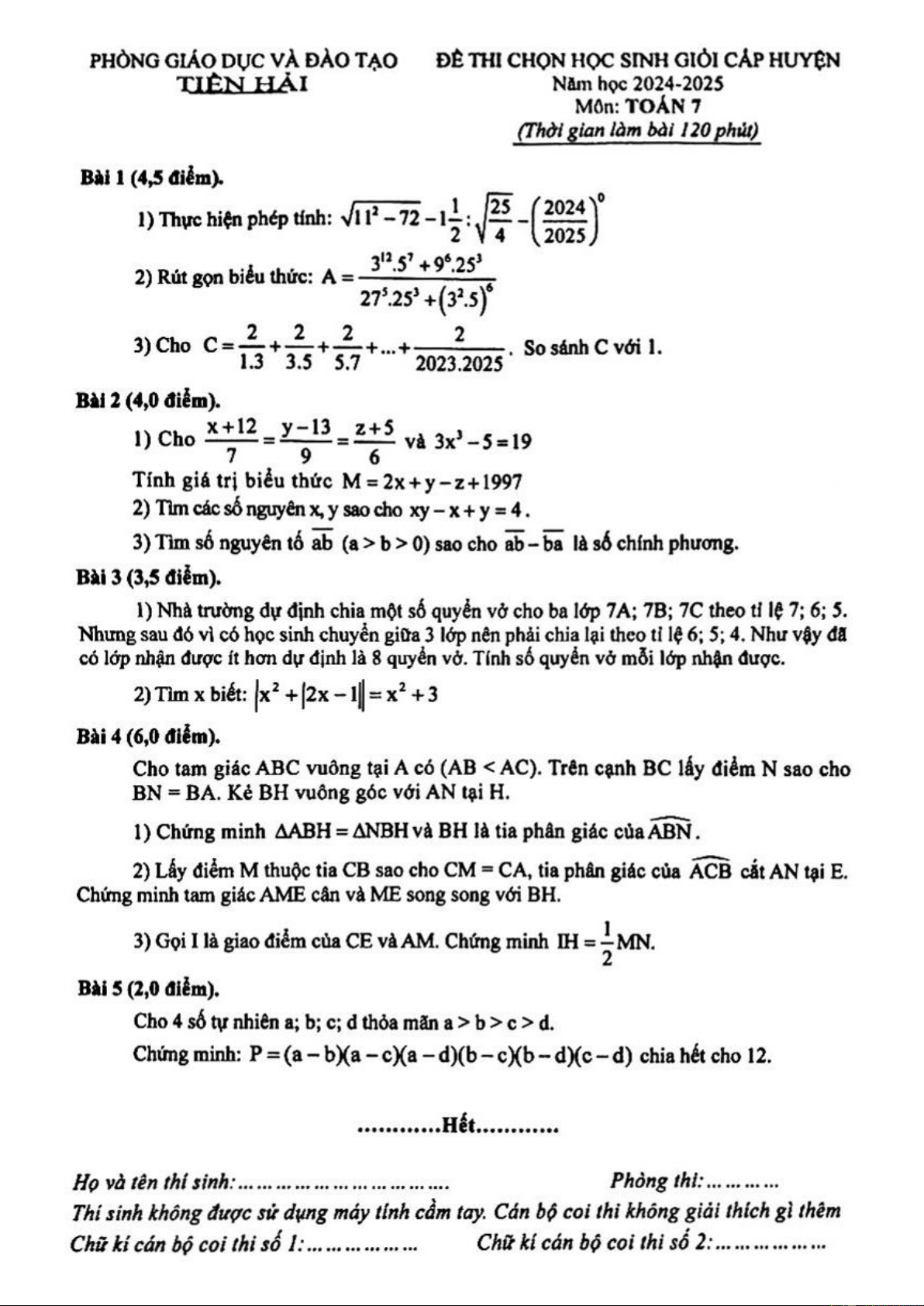 ĐỀ KHẢO SÁT HỌC SINH GIỎI CẤP HUYỆN TIỀN HẢI Năm học 2024 -2025 Môn: TOÁN 7