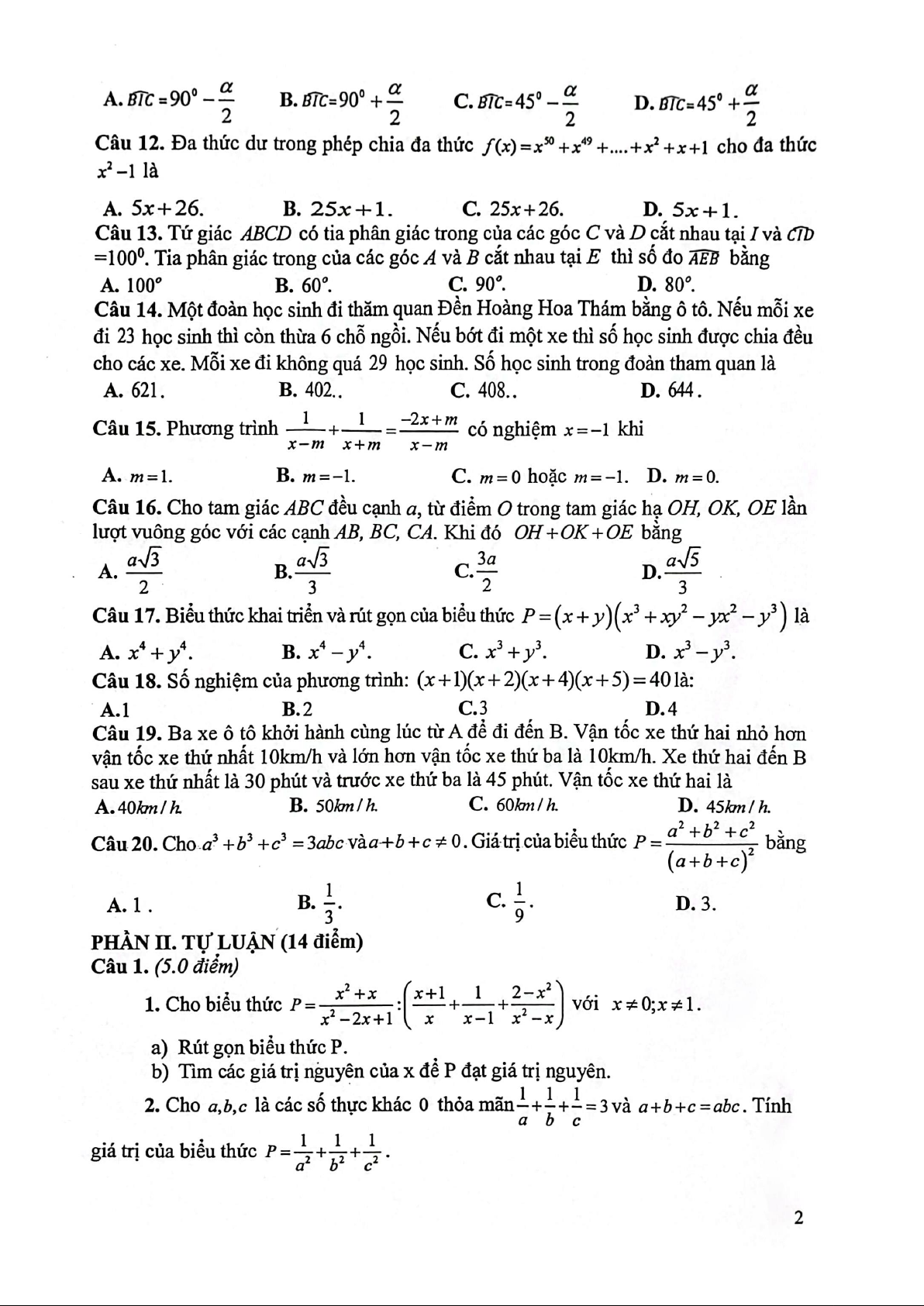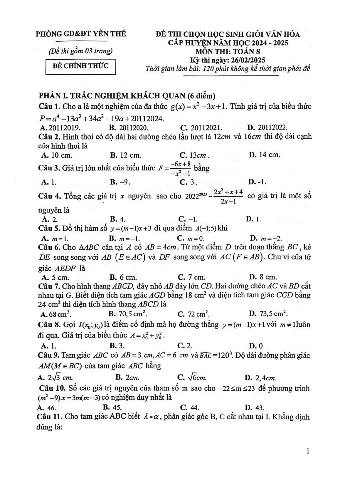 Giới thiệu đến quý thầy, cô giáo và các em học sinh lớp 8 đề thi chọn học sinh giỏi văn hóa cấp huyện môn Toán 8 năm học 2024 – 2025 phòng Giáo dục và Đào tạo huyện Yên Thế, tỉnh Bắc Giang. Đề thi gồm 20 câu trắc nghiệm khách quan (06 điểm) + 04 câu tự luận (14 điểm), thời gian làm bài 120 phút. Kỳ thi được diễn ra vào ngày 26 tháng 02 năm 2025.