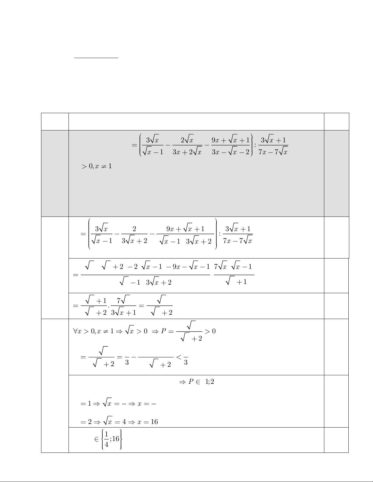 Lưu ý: Điểm toàn bài lấy điểm lẻ đến 0,125; thí sinh làm cách khác đúng vẫn cho điểm tối đa. Câu Nội dung Điểm 3 x 2 x 9x x 1 3 x 1 1. Cho biểu thức P : , x 1 3x 2 x 3x x 2 7x 7 x 5,0 Câu x 0,x 1 . 1