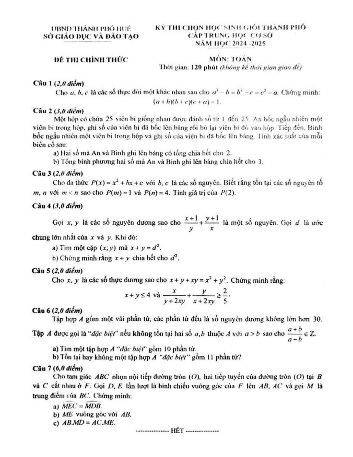 Giới thiệu đến quý thầy, cô giáo và các em học sinh lớp 9 đề thi chọn học sinh giỏi cấp thành phố môn Toán THCS năm học 2024 – 2025 sở GD&ĐT UBND thành phố Huế.