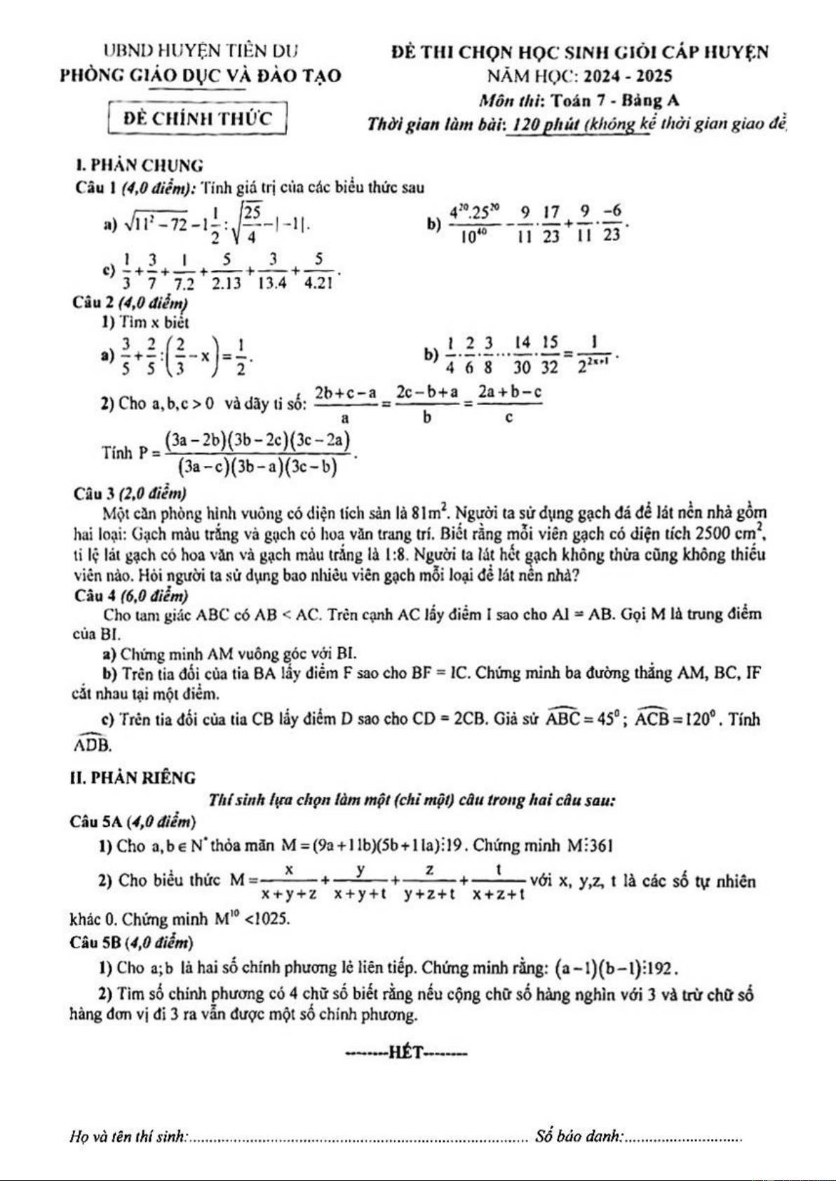 Đề chọn HSG cấp huyện Toán 7 năm 2024 – 2025 phòng GD&ĐT Tiên Du – Bắc Ninh
